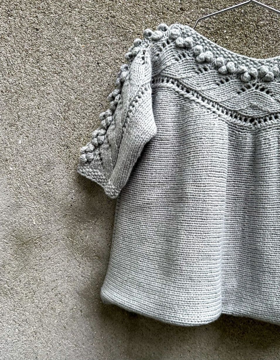Blusen har 3/4 lange ermer og strikkes ved hjelp av vendestrikk.