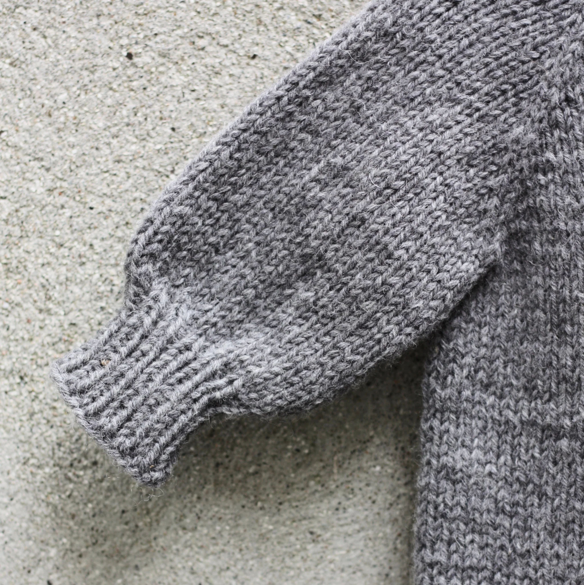Modellen på bildet er strikket i Heavy Merino – Regnvejrsdag