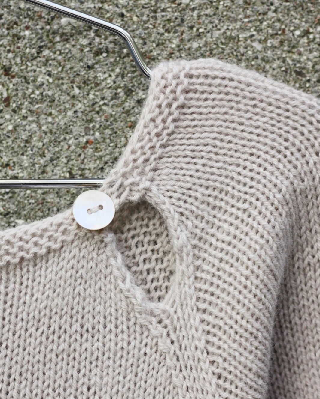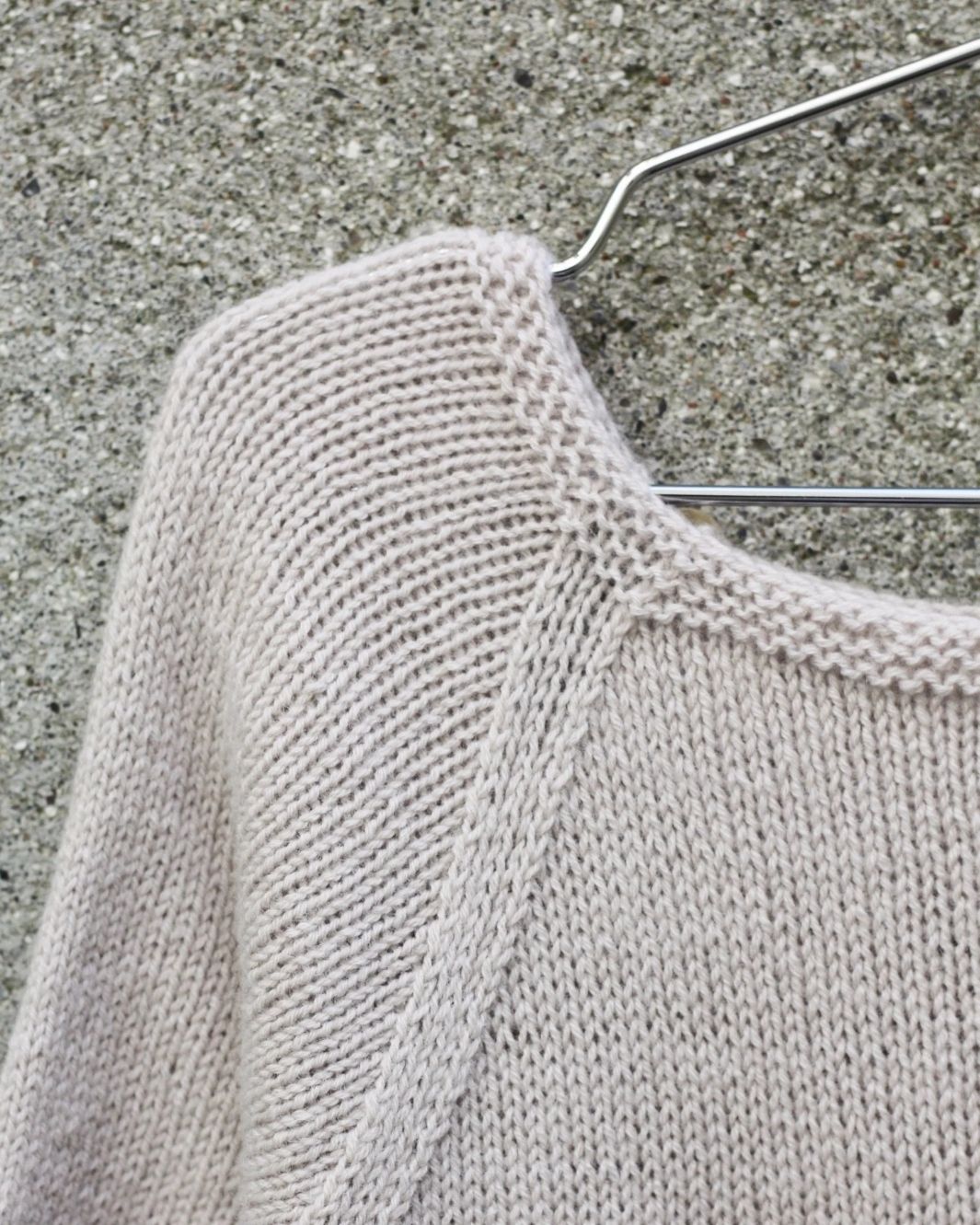 Størrelse 6-9 og 12-18 måneder, samt 2 år, avsluttes med en splitt ved den ene raglanfellingen.