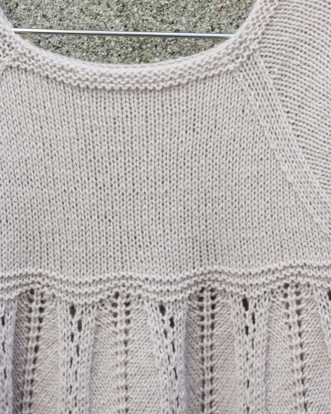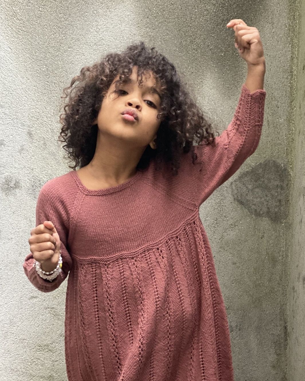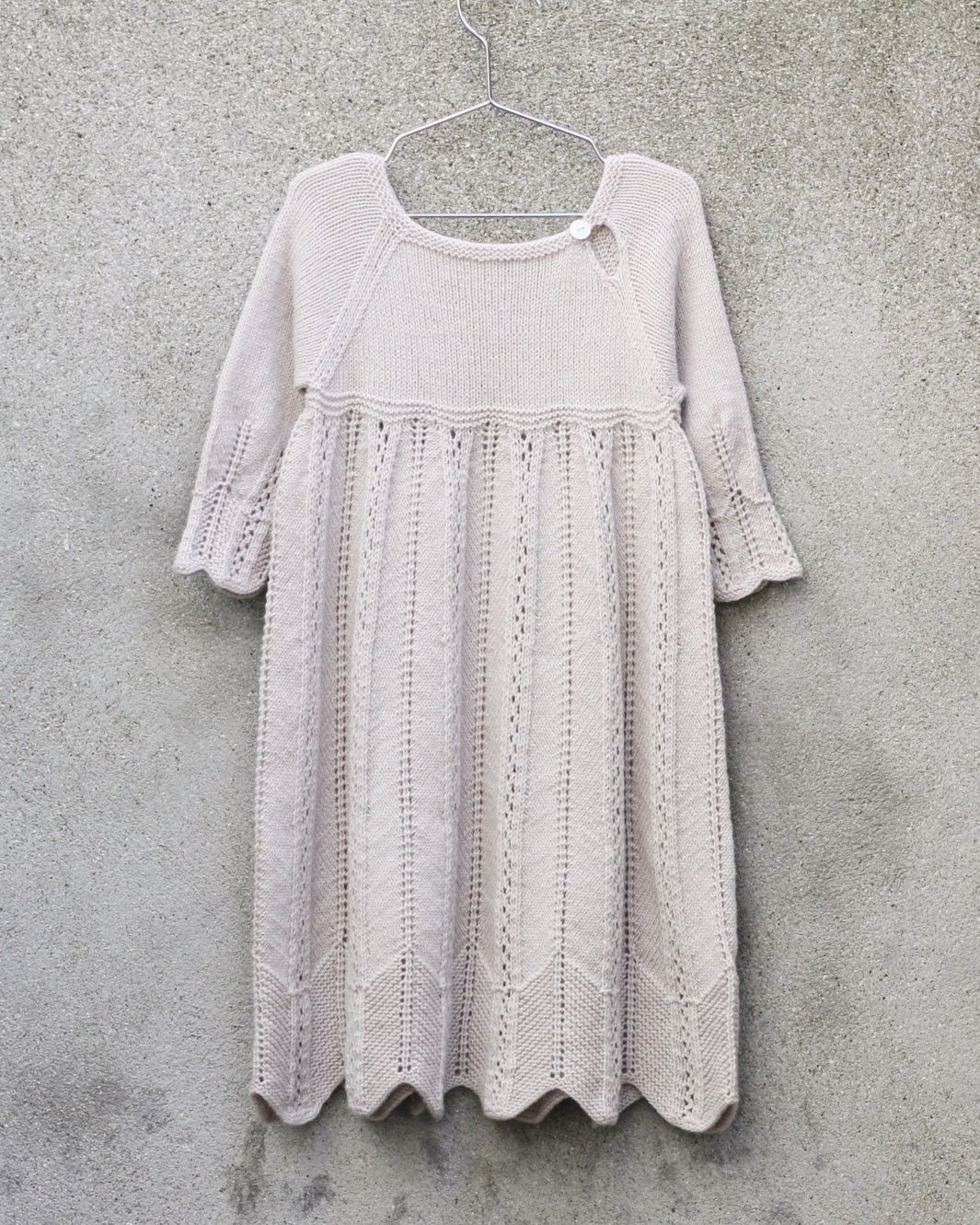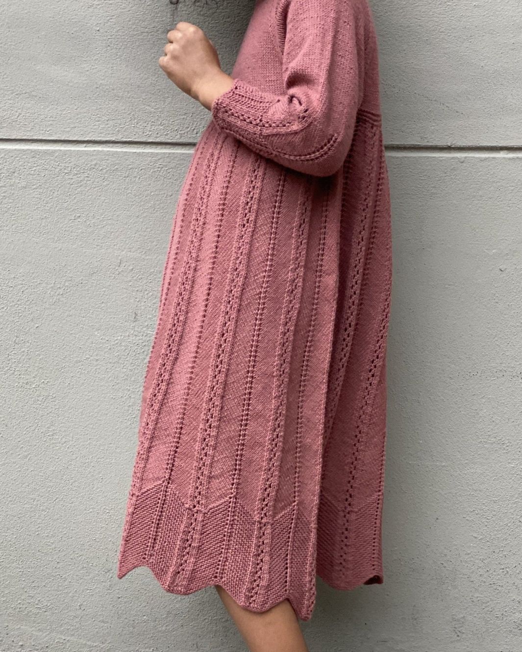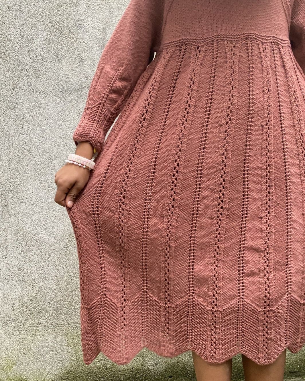 Nydelig kjole stikket i merino. Kjolen har et vidt skjørt i et fint hullmønster på langs og et glattstrikket bærestykke.