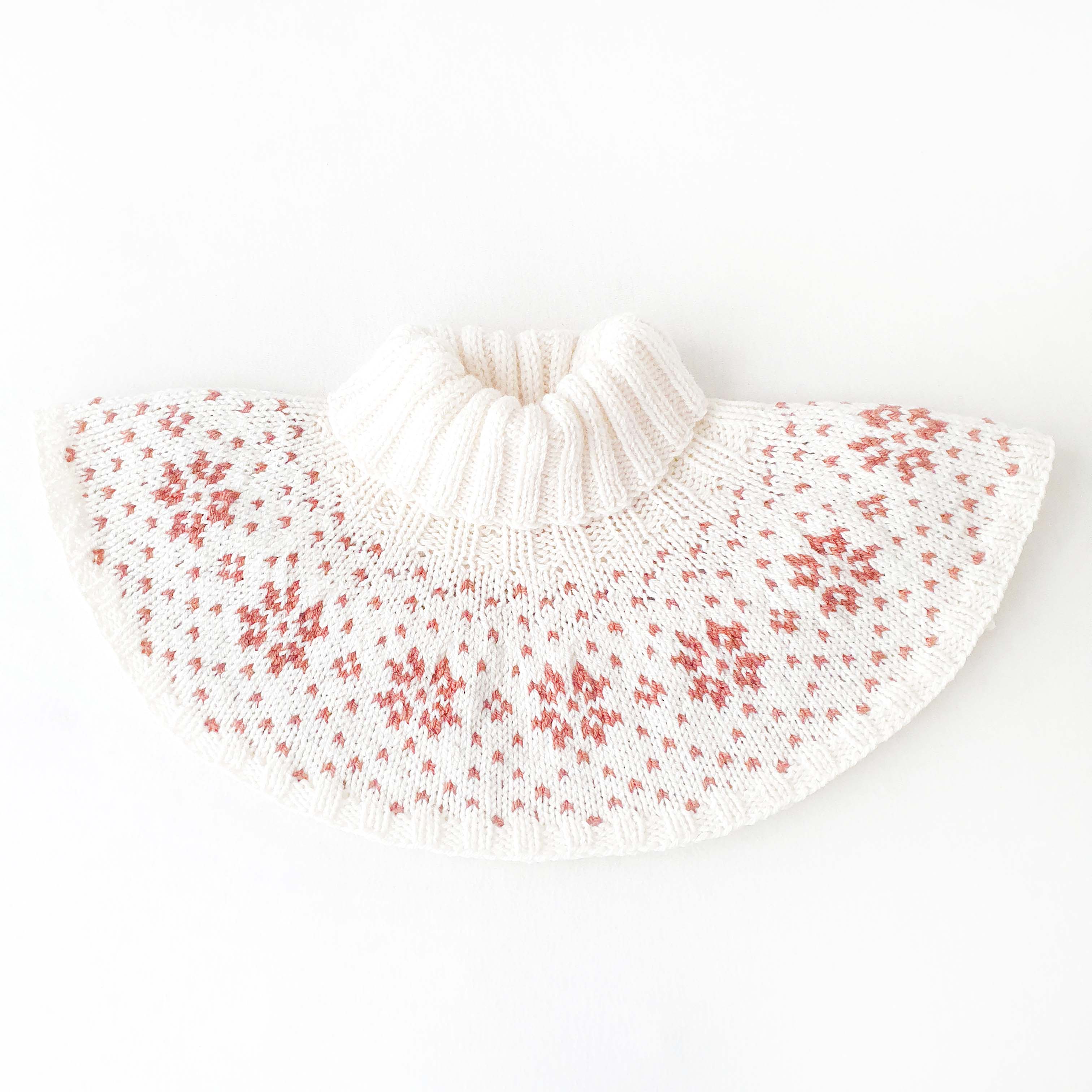 Mimmihals-oppskriften fra Tonje i Oslo gir deg en rund hals med nedbrettet kant og et vakkert stjernestøv- og selbumønster rundt skuldrene — strikkes ovenfra og ned og leveres som digital PDF i størrelser fra baby til voksen.