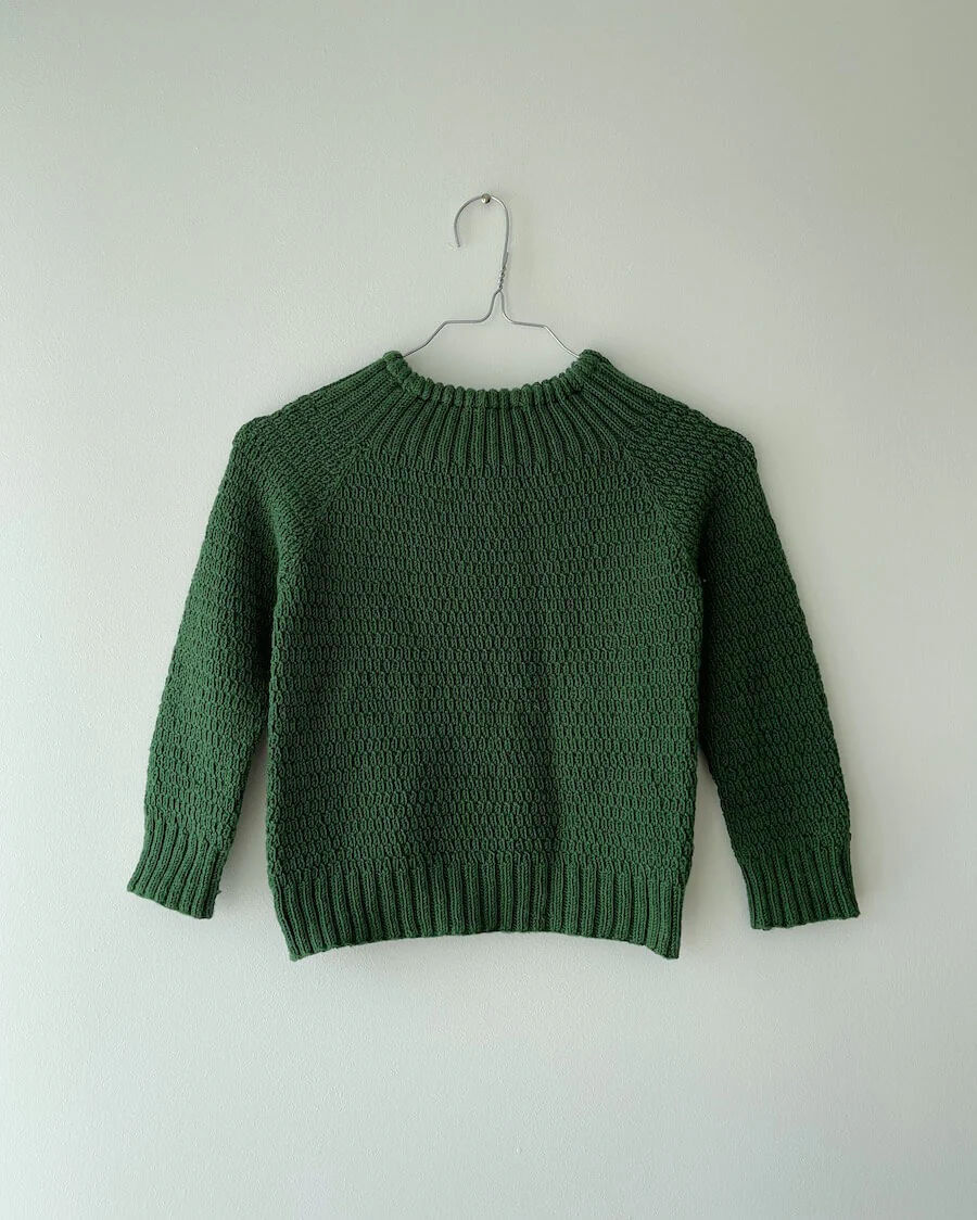Den grønne Alfreds Trøye er strikket i Tynn Merinoull fra Sandnes Garn i fargen Skoggrønn [8072].
