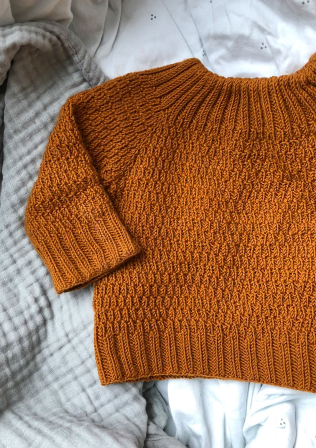 Den brune Alfreds Trøye er strikket i Tynn Merinoull fra Sandnes Garn I fargen Mørk karry [2336].