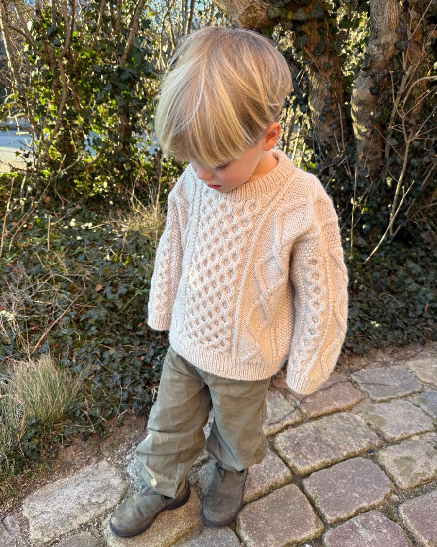 Veiledende pinner: Rundpinne 4 mm (60 eller 80 cm), rundpinne 3,5 mm (40, 60 og/eller 80 cm), rundpinne 3 mm (40 cm), strømpepinner 3 mm og 4 mm