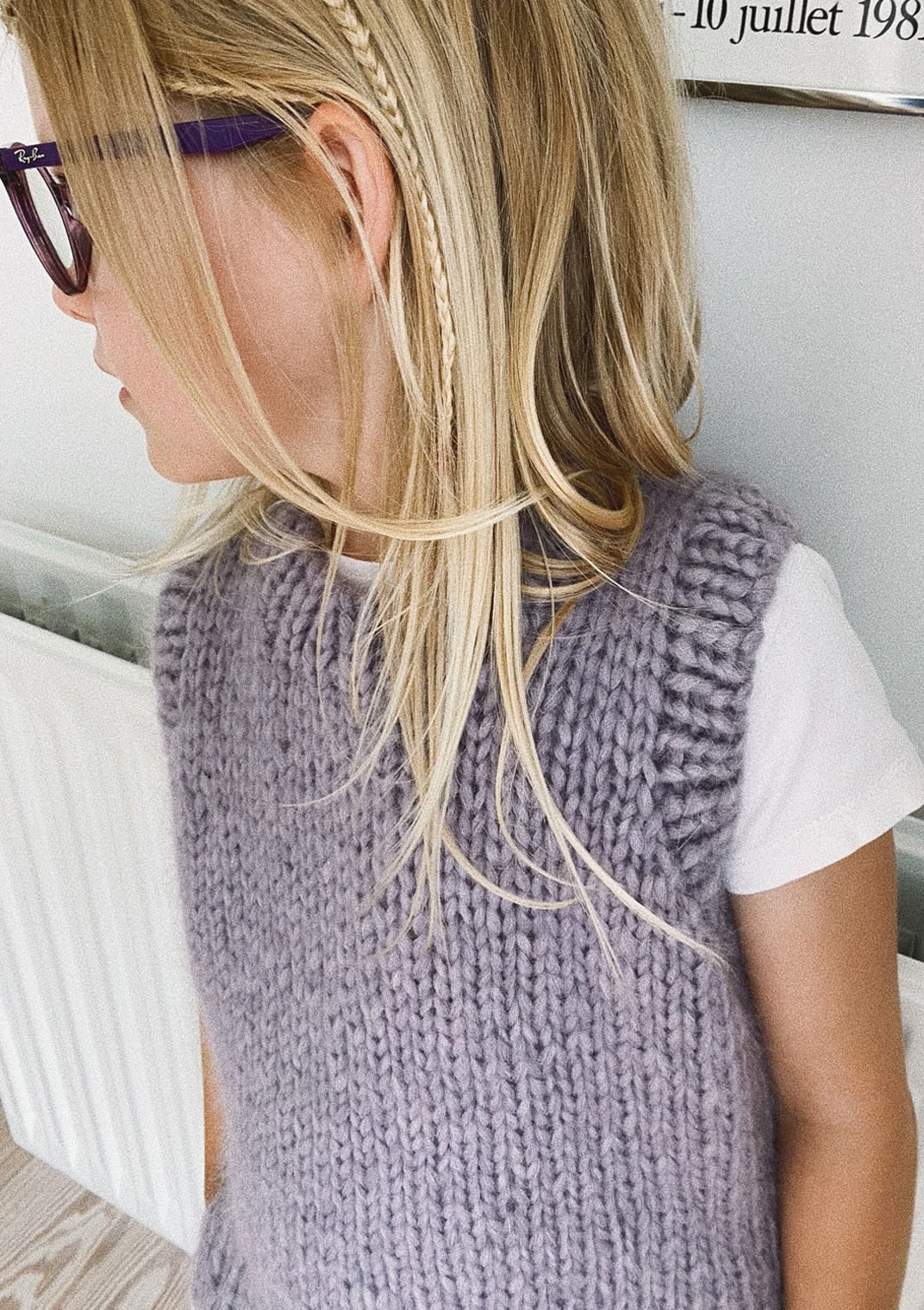Holiday Slipover Junior er en chunky slipover med et dypt ermehull. Holiday Slipover Junior strikkes ovenfra og ned i glattstrikk. Først strikkes bakstykket, så skuldre og forstykket og til slutt bol. Nederst på bolen strikkes en todelt vrangbordkant, hvor bakre stykke strikkes lenger enn fremre. Langs halsåpning og ermehull strikkes det til slutt vrangbordkanter som avsluttes med italiensk avfelling for et flott ferdig uttrykk.