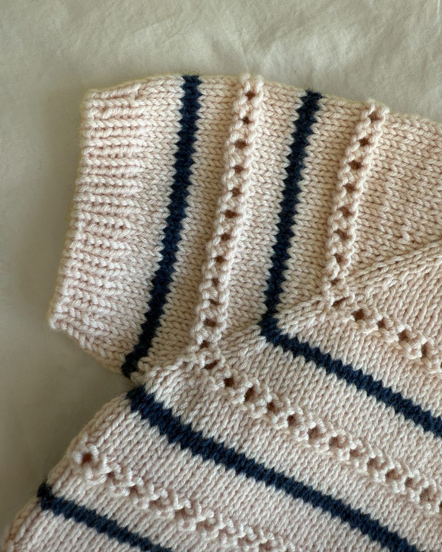 Ida Tee Junior strikkes ovenfra og ned med et mønster av strukturstrikk og striper. Toppen strikkes i Duo.