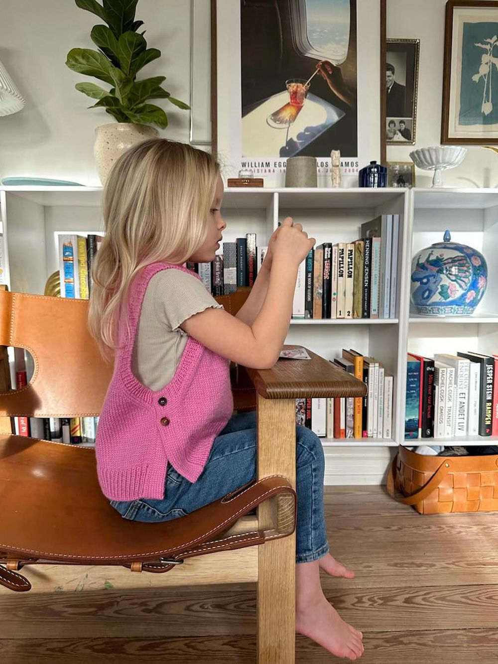 Lulu Slipover Junior strikkes ovenfra og ned. Vesten har dype ermehull og lukkes i sidene med to knapper.