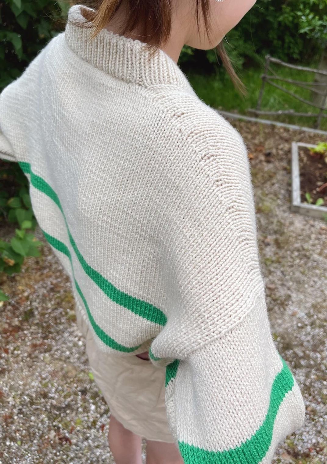 Marseille Sweater Young strikkes ovenfra og ned. Først strikkes øverste del av bakstykket frem og tilbake, og skråning av skuldrene formes med vendepinner (forkortede pinner) for en god passform. Deretter strikkes skuldrene på samme måte med vendepinner hver for seg, frem og tilbake på rundpinne. Skuldrene samles foran for å danne forstykket. Forstykket og bakstykket samles deretter for å danne bolen som strikkes rundt på rundpinne. Ermene strikkes ut fra opplukkede masker langs ermeåpningen. Ermene strikkes rundt på rundpinne og på strømpepinner eller med Magic Loop-teknikk. Halsens vrangbordkant strikkes til slutt ut fra opplukkede masker, og den legges dobbelt og strikkes ned til slutt. Marseille Sweater Young strikkes med striper, og plasseringen av disse er angitt i oppskriften.