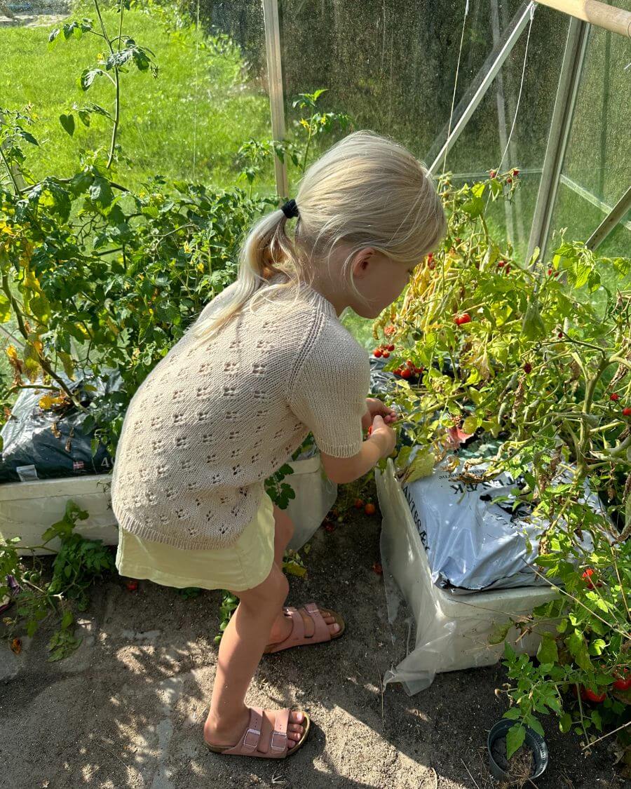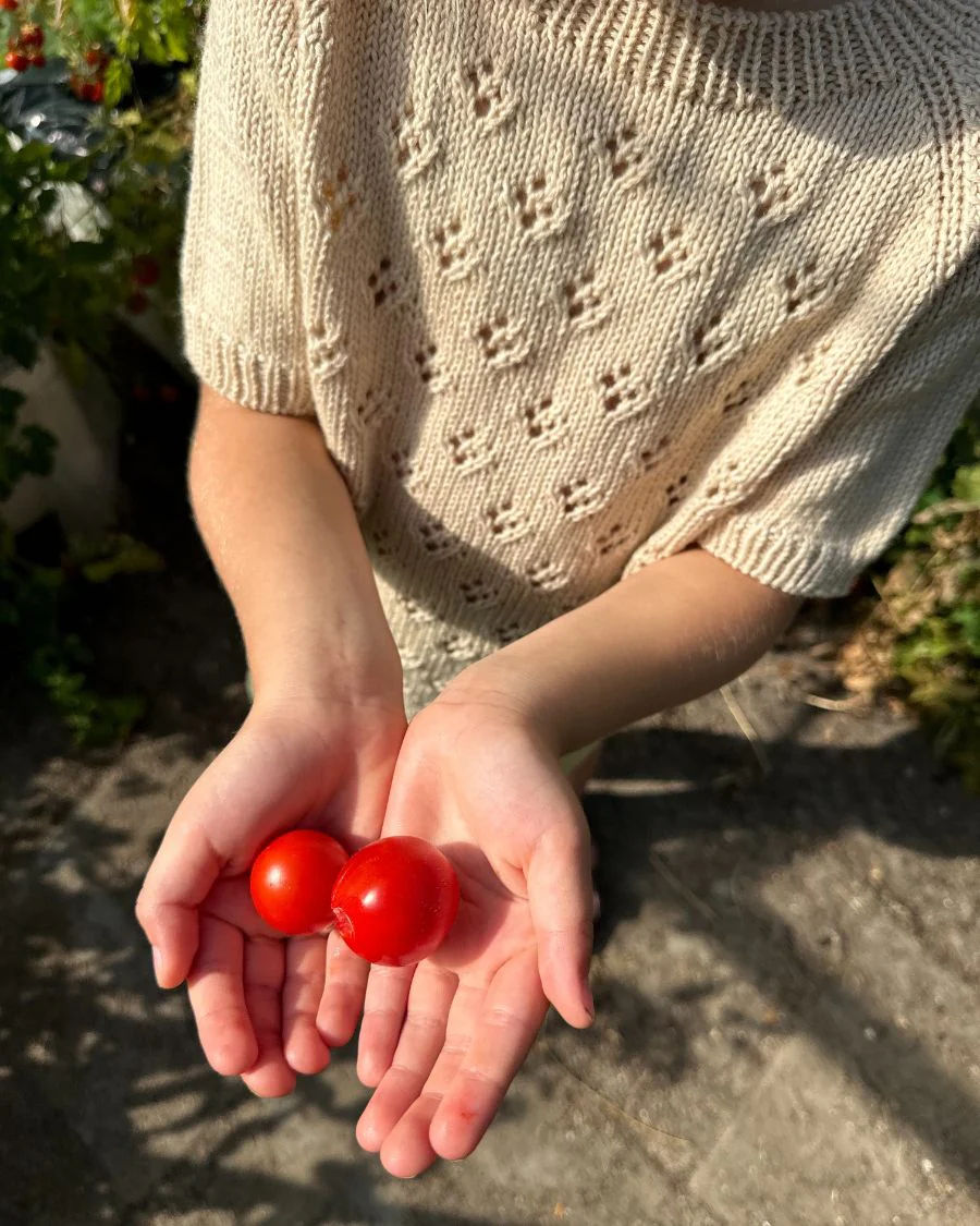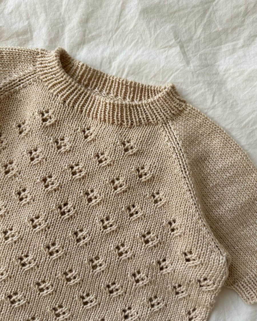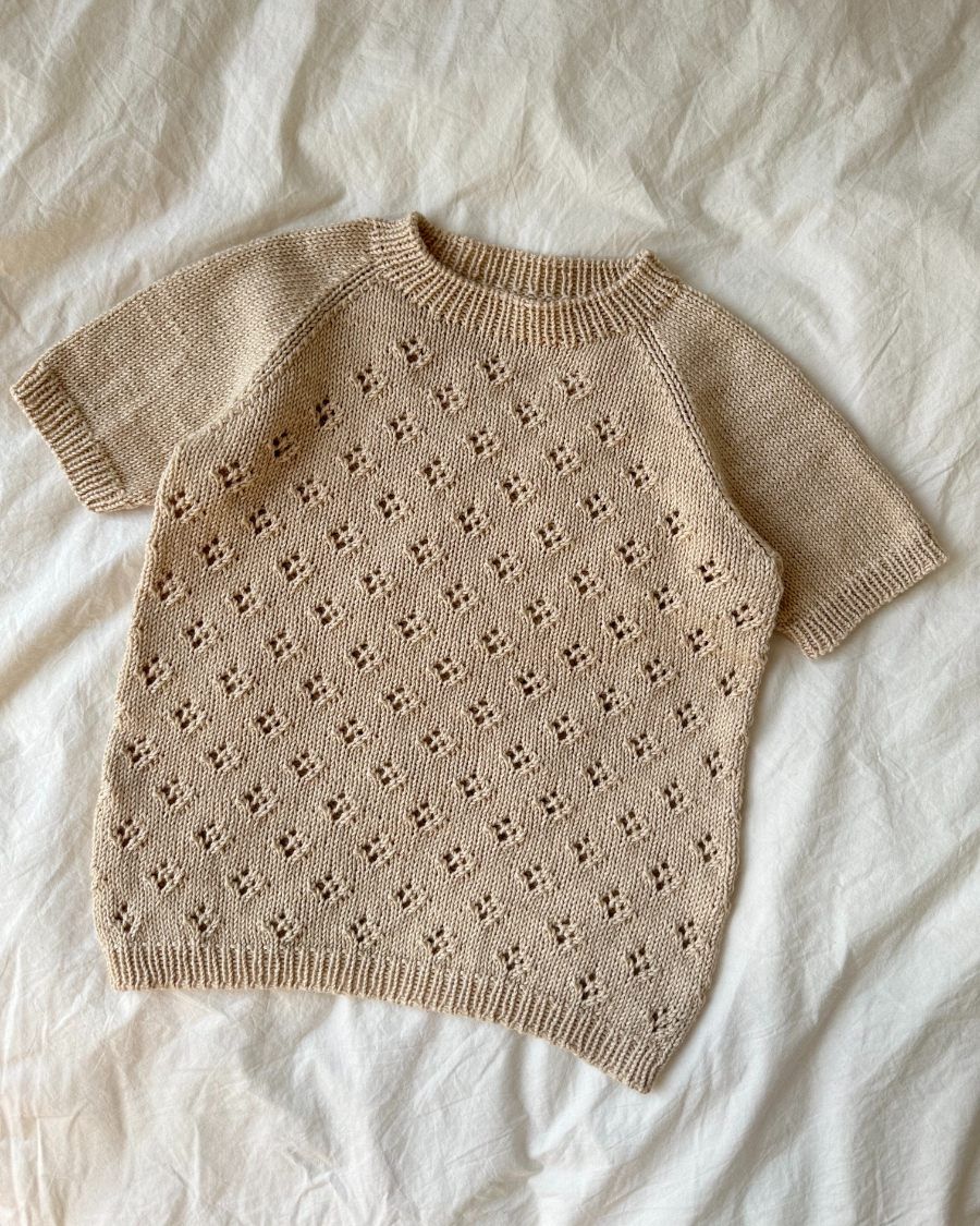 Rigmors Sommerbluse strikkes på rundpinne nedenfra og opp med raglanfellinger. Ermene strikkes rundt på strømpepinner.