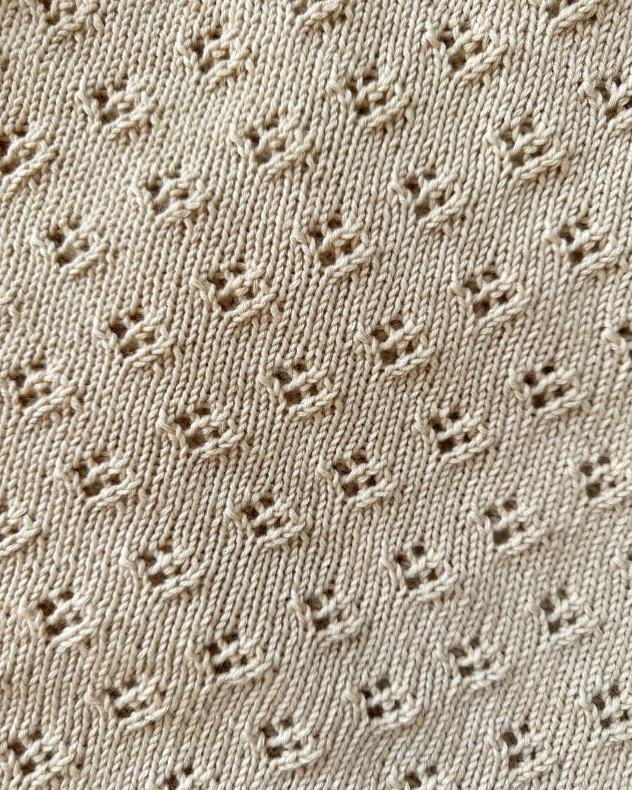 Strikkefasthet: 22 masker x 32 pinner i hullmønster på pinne 3,5 mm = 10 x 10 cm