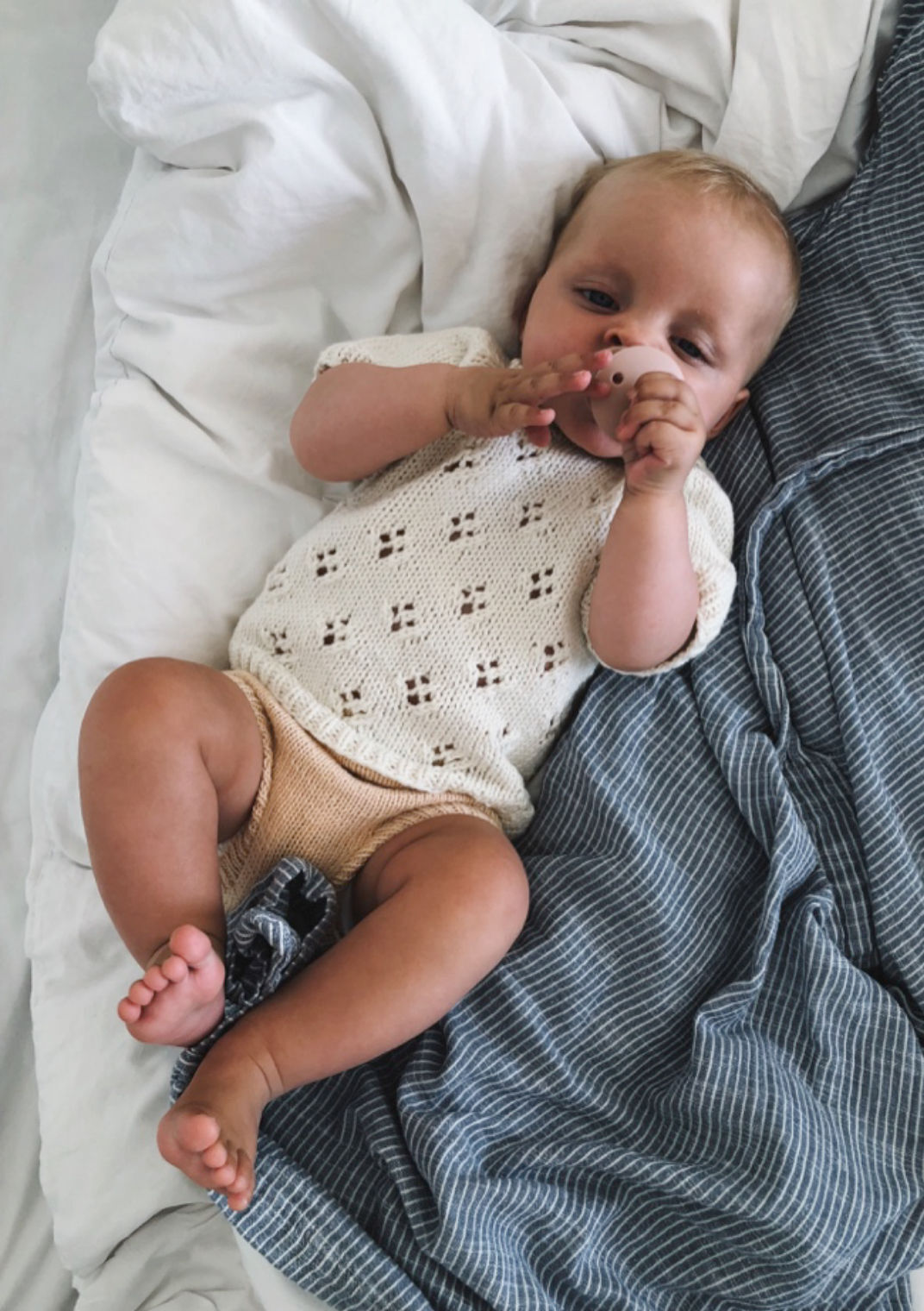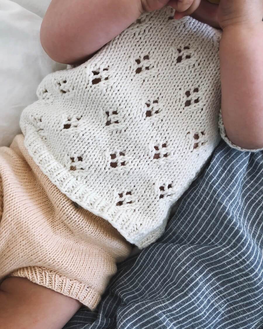Den hvite Rigmors Sommerbluse er strikket i Duo fra Sandnes Garn i fargen Hvit [1002].