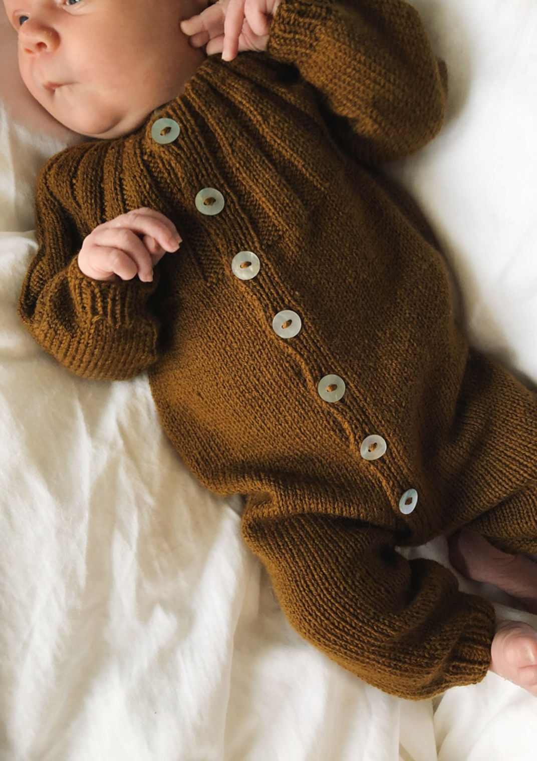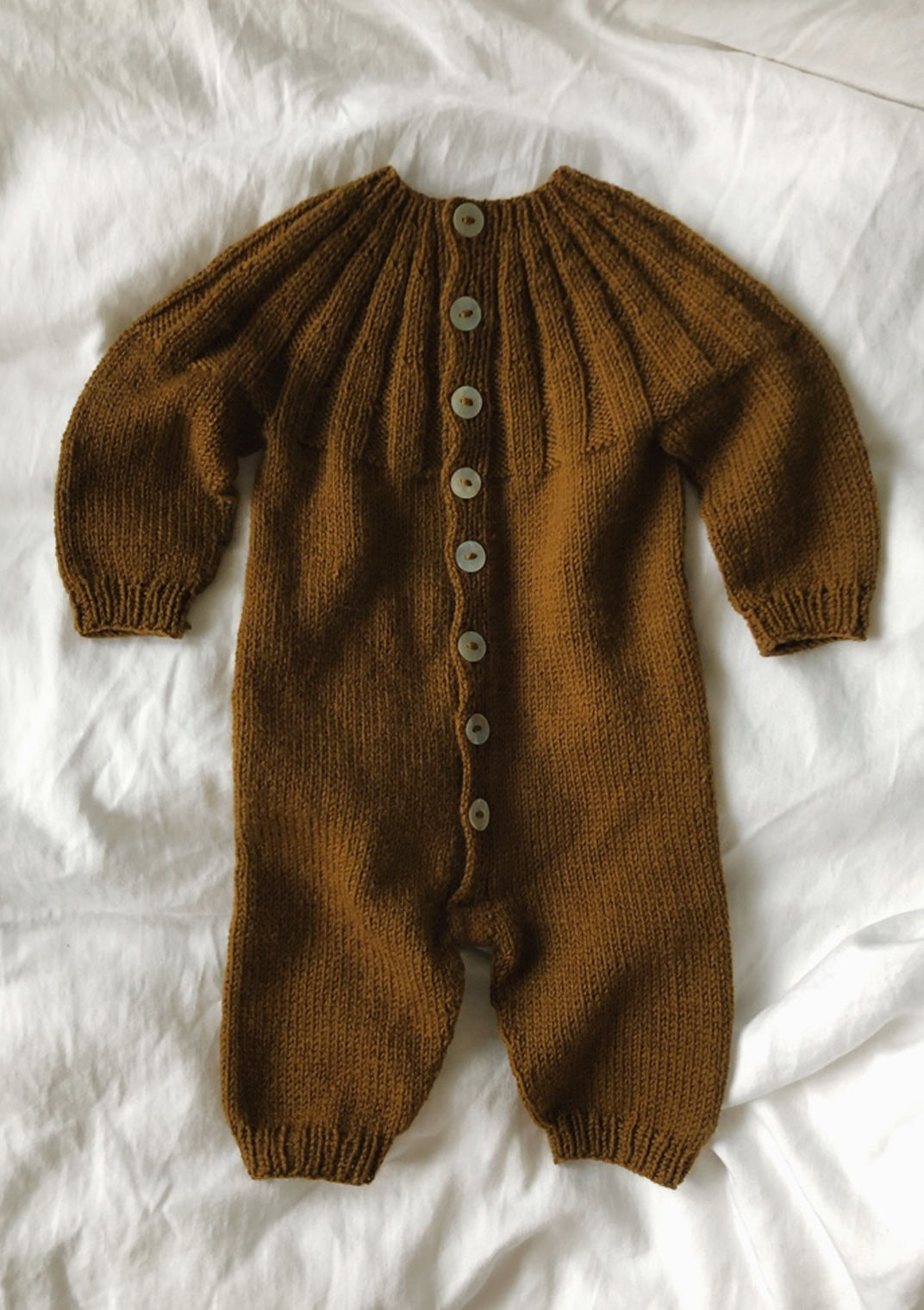 Sunday Suit strikkes ovenfra og ned og lukkes med knapper på fremsiden. Bærestykket består av ribb med økninger, mens resten av drakten strikkes i glattstrikk. Bærestykke og bol strikkes frem og tilbake på rundpinne, mens ermer og ben strikkes rundt på strømpepinner eller med Magic Loop-teknikk. Sunday Suit er monteringsfri.