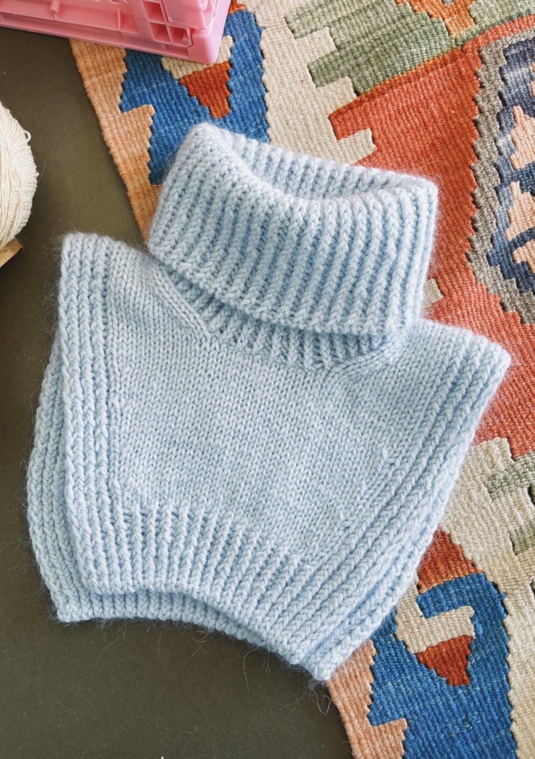20-22 masker x 24 pinner i vrangbord (1 vridd r, 1 vridd vr) på pinne 4,5 mm = 10 x 10 cm etter vask og blokking (strikkefasthet til polokragen)