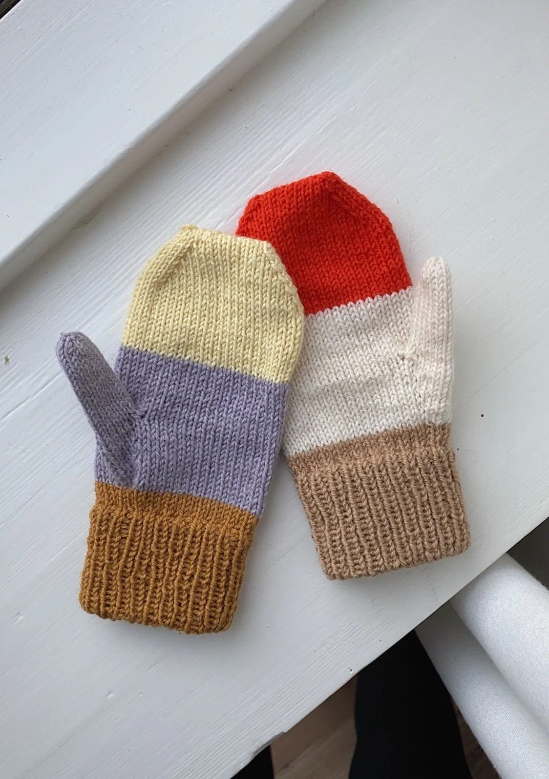 Vesterhavsvotter Junior strikkes fra håndleddet og frem mot fingrene. De kan strikkes rundt på strømpepinner eller på en lang rundpinne med Magic Loop-teknikk.