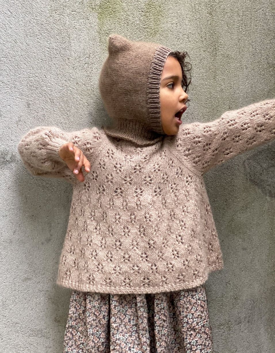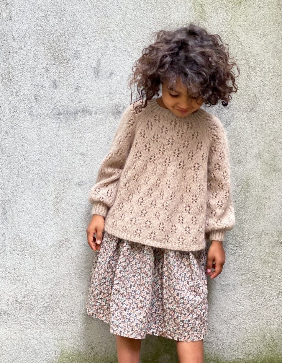 Tips: Blusen er romslig, og størrelse 8 år kan derfor også brukes av en størrelse 10-12 år, hvor blusen strikkes i ønsket lengde.