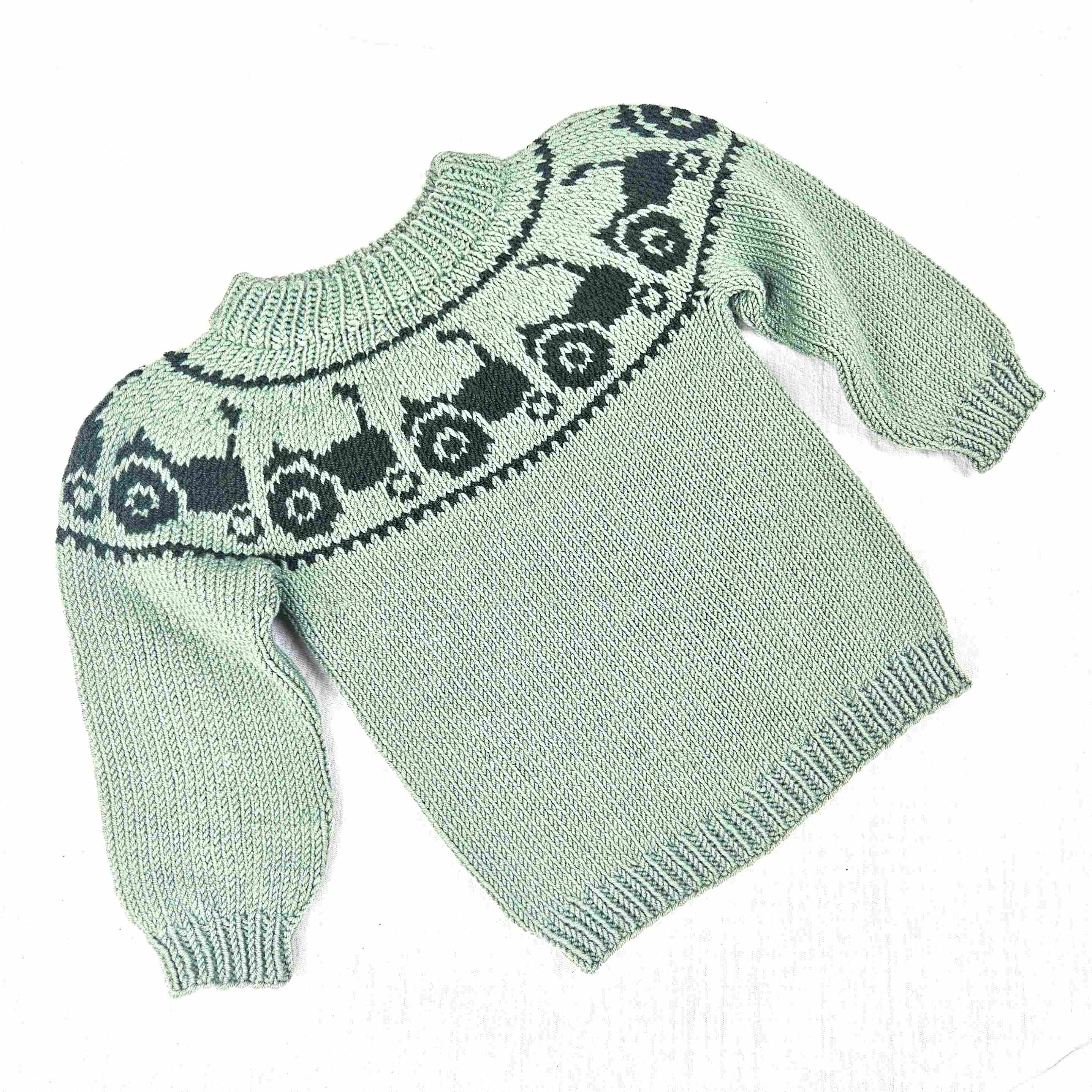 Retro traktorgenser er en nostalgisk og morsom barnegenser med traktormotiv på bærestykket. Genseren strikkes ovenfra og ned i Sandnes Double Sunday – et mykt og slitesterkt garn som gjør den like komfortabel som den er sjarmerende