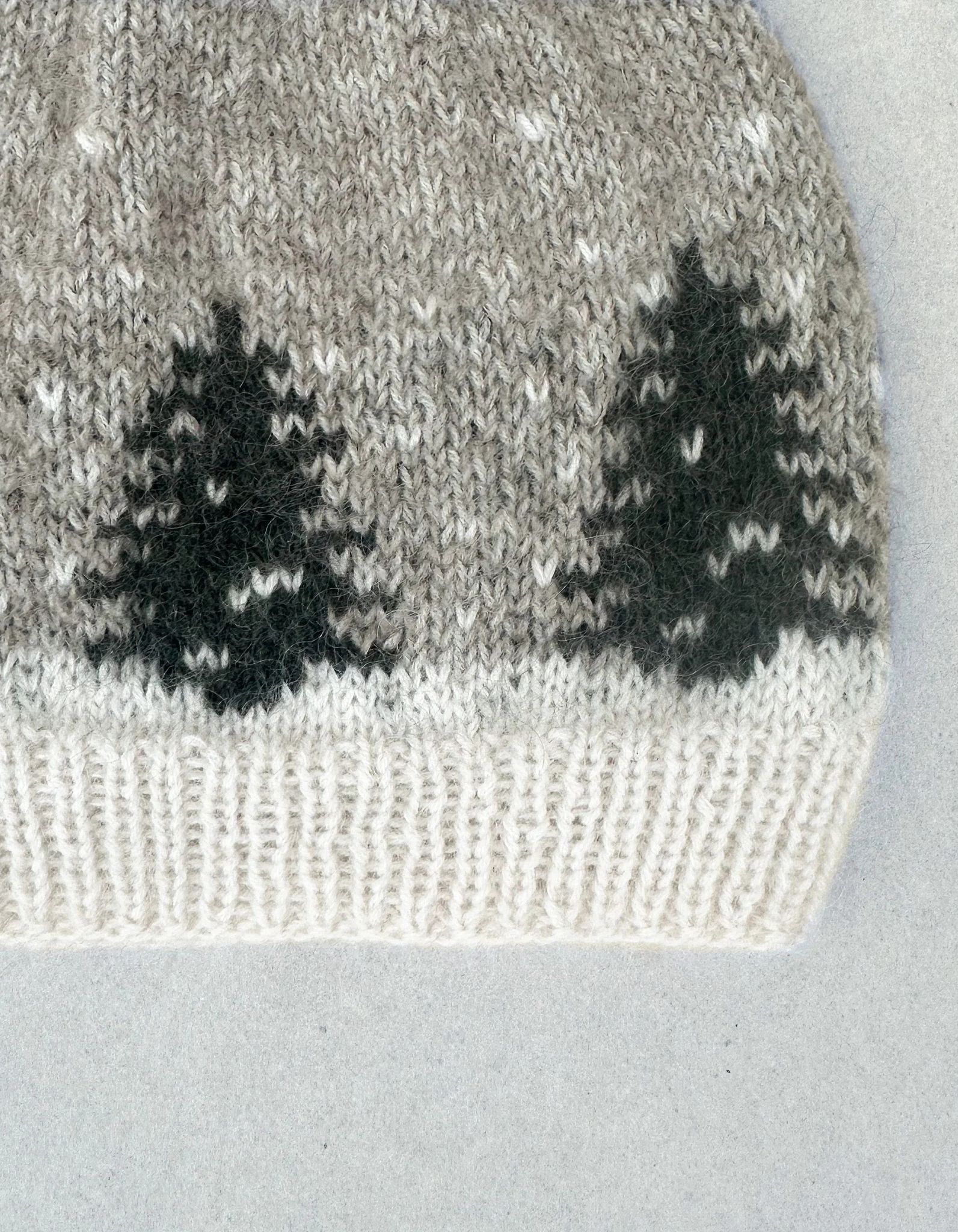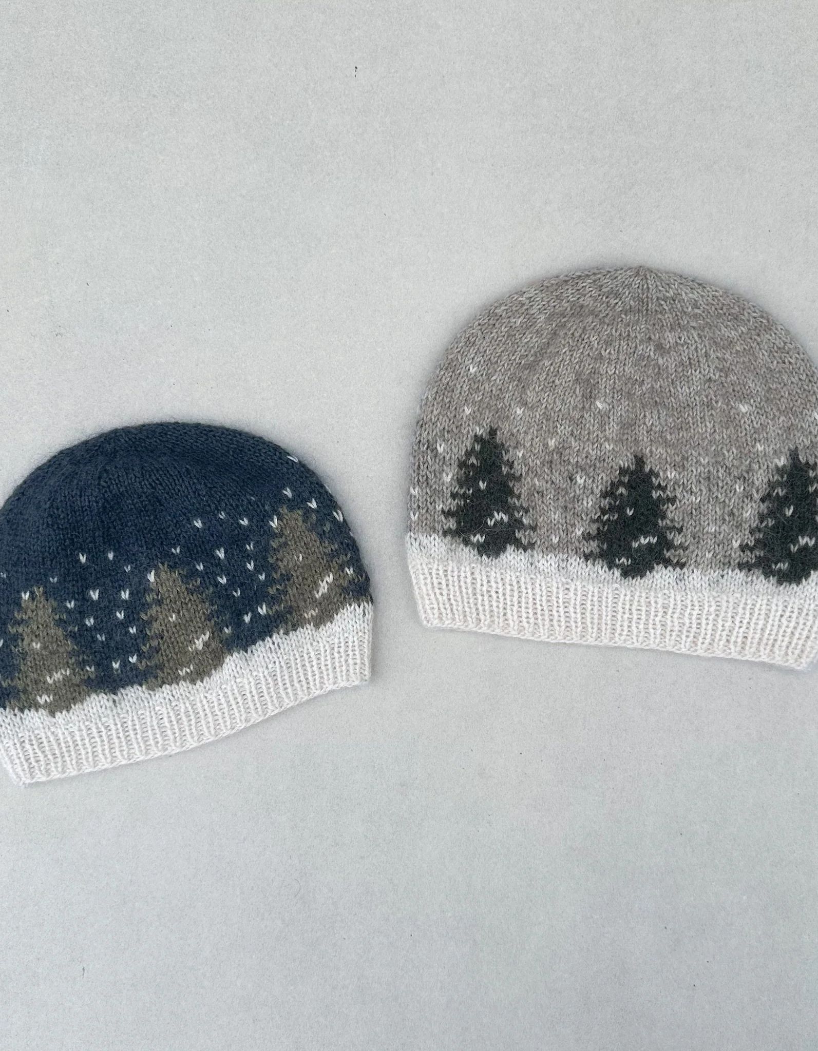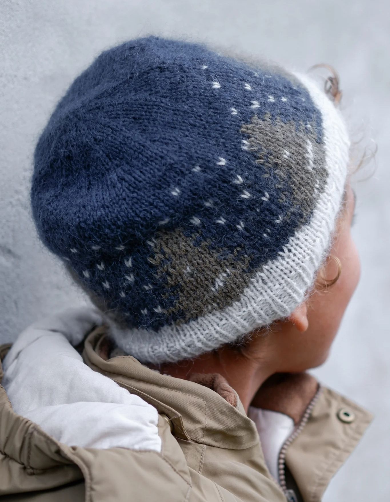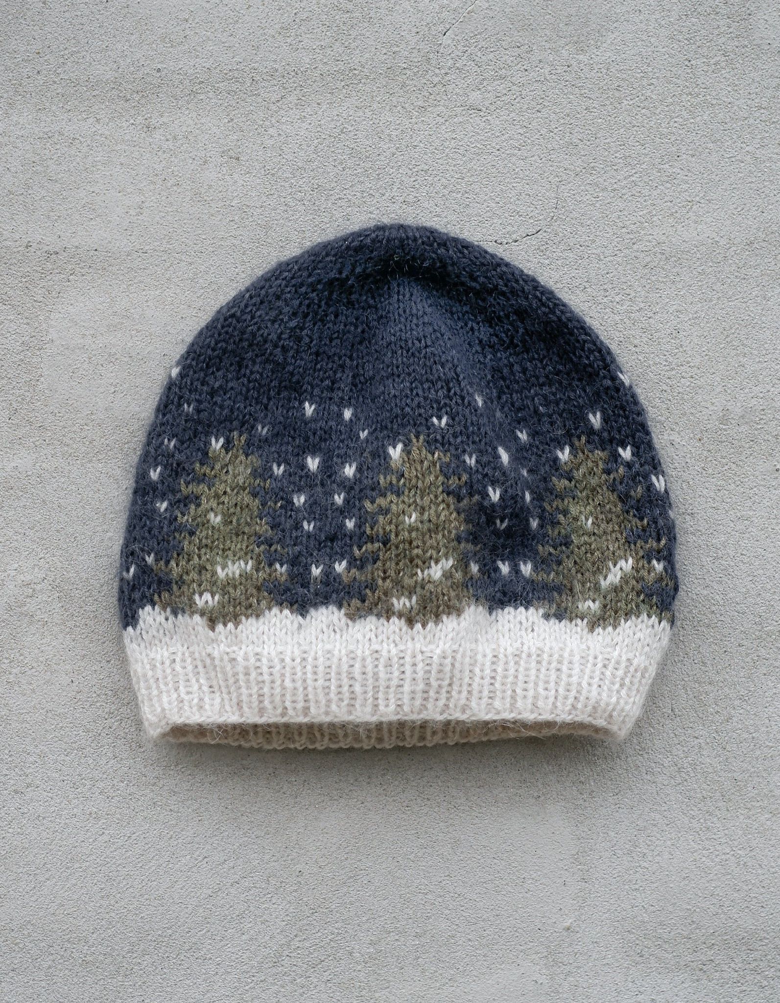 Modellen på bildet er strikket i farge 1 (bunnfarge) Dyb Petroleumsblå (Merino) og Midnat (Soft Sill Mohair) og farge 2 (snø) Fløde og farge 3 (trær) Støvet Oliven