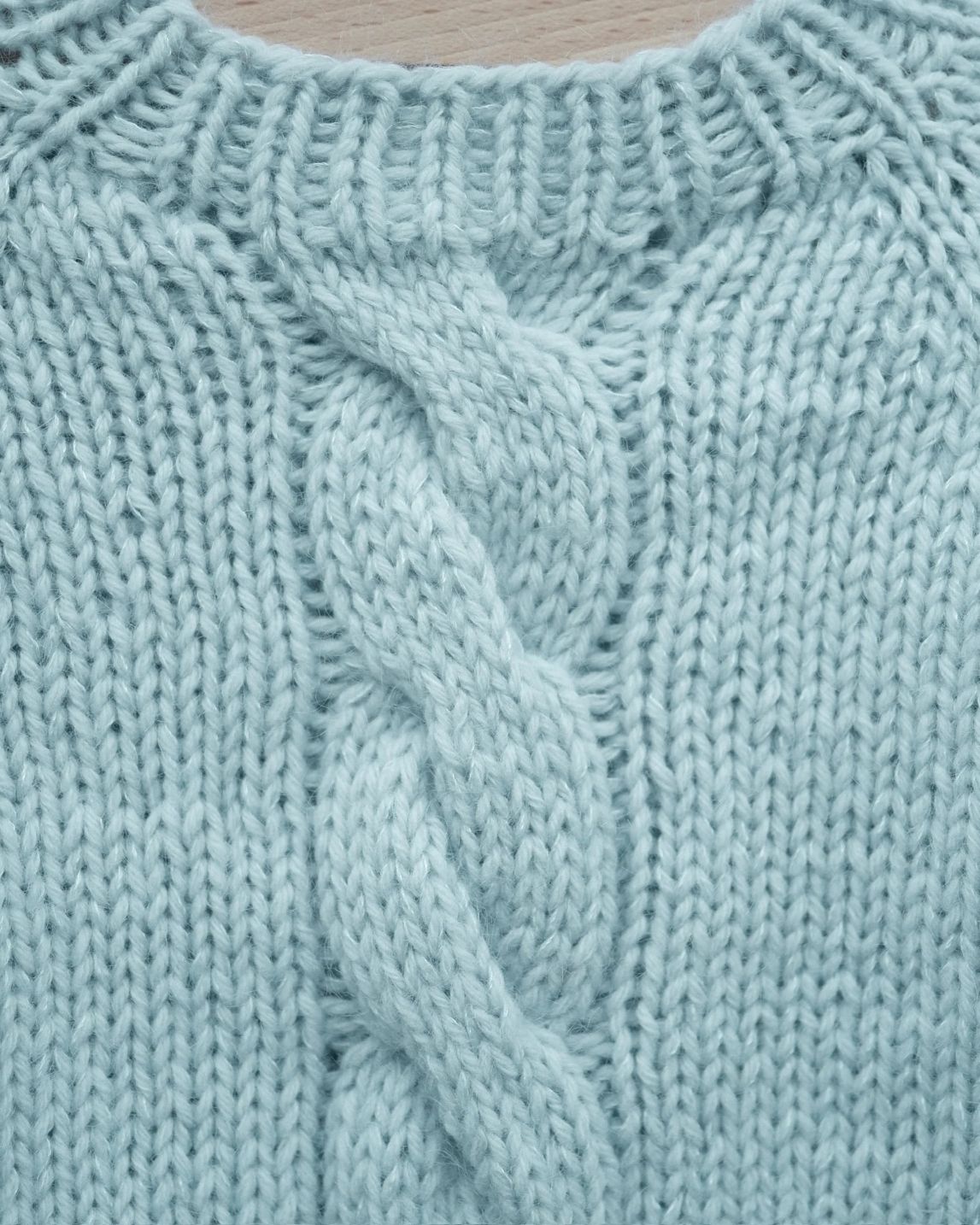 Nydelig genser med stor flette i front. Genseren strikkes med en tråd Heavy merino sammen med en tråd soft silk mohair på pinne nr 6.