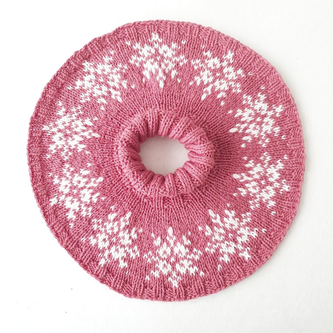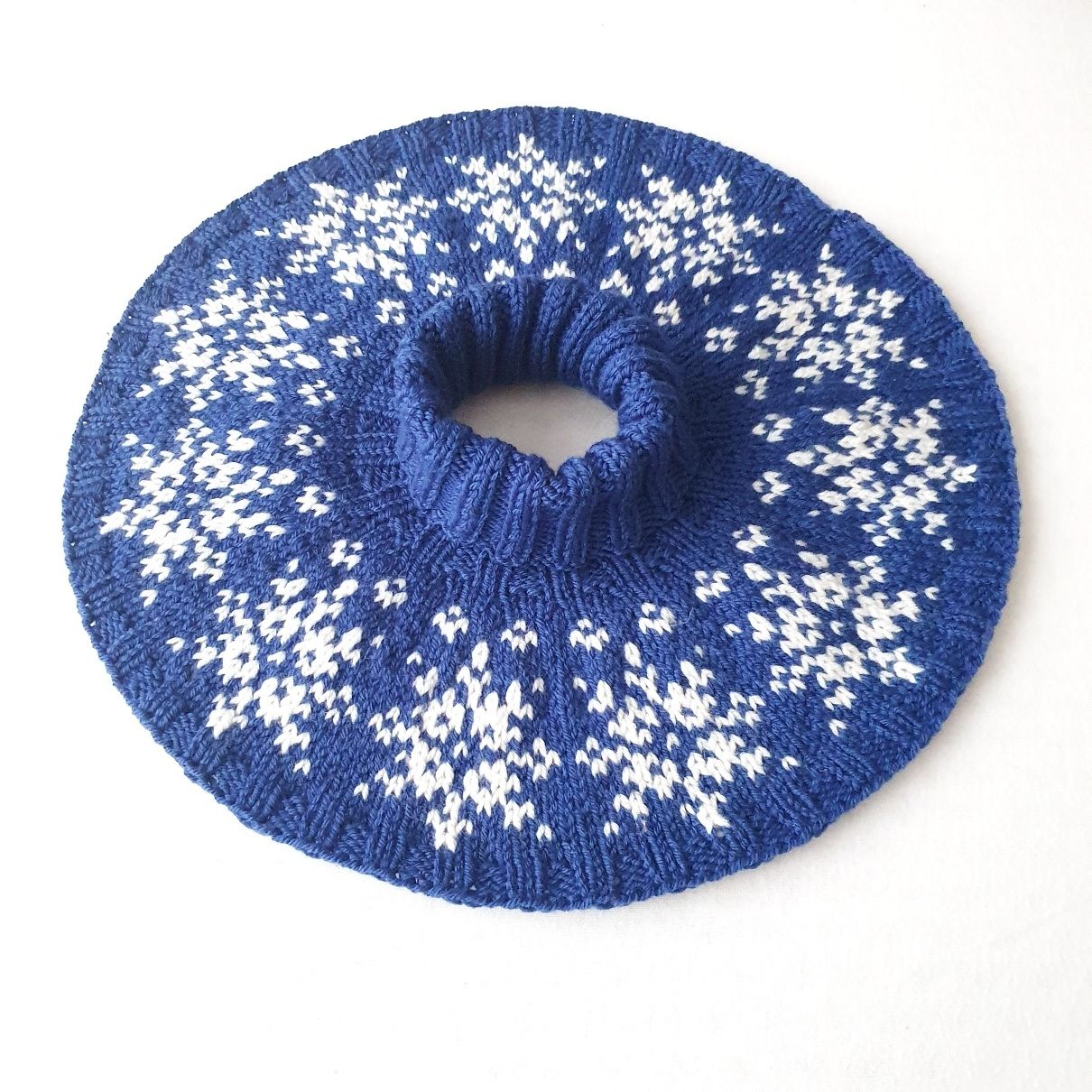 Snøfnugghals er en halsoppskrift av Tonje i Oslo med rund hals og nedbrettet kant, dekorert med et elegant snøfnuggmønster over skuldrene — strikkes ovenfra og ned og tilgjengelig i størrelser for barn og voksen.