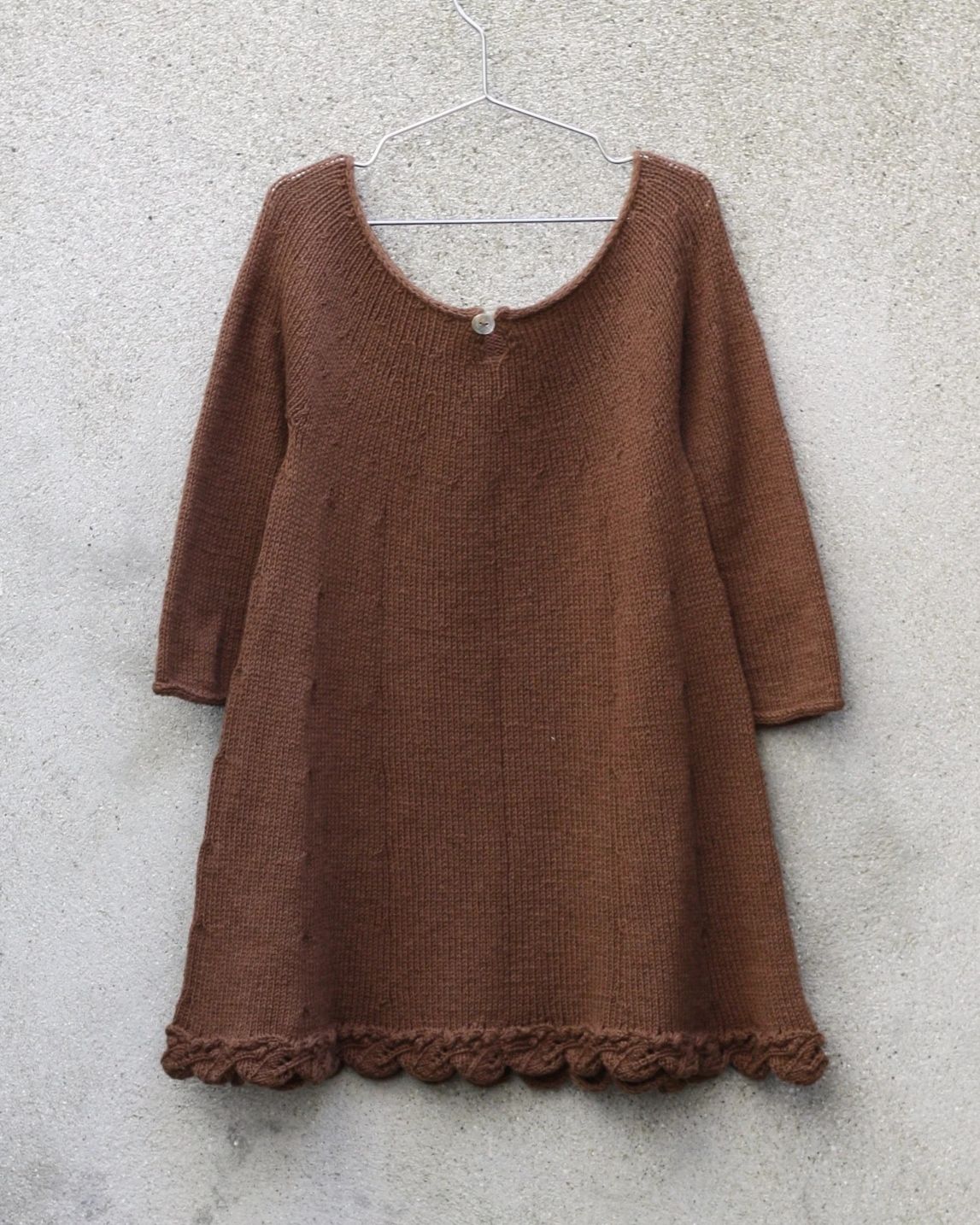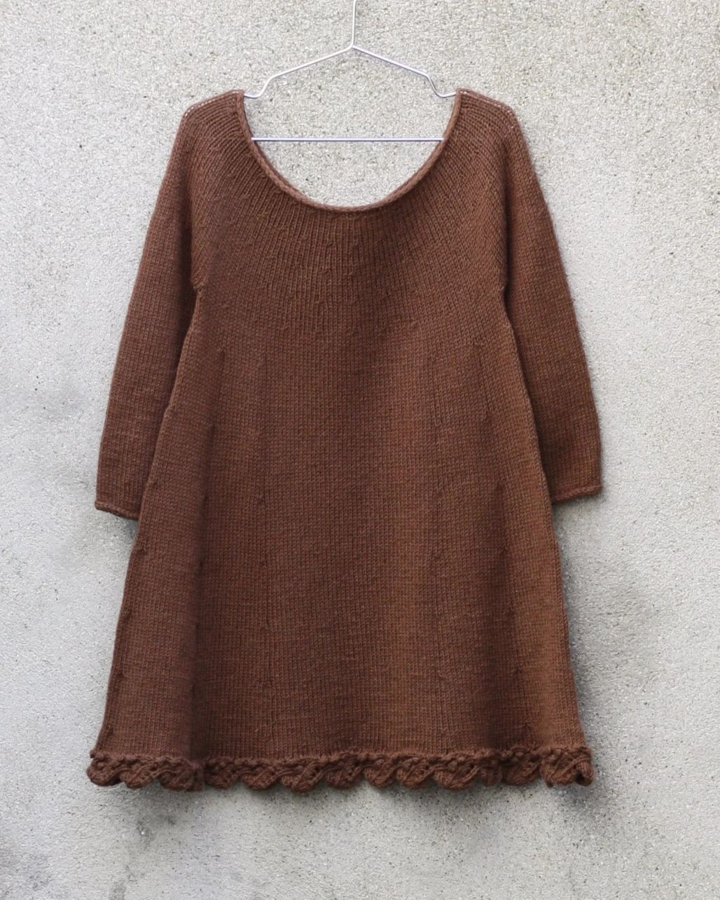 Først strikkes stikkelsbærkanten frem og tilbake, deretter hentes m opp til skjørtet, og det strikkes rundt. Kjolen kan strikkes med korte, 3/4 lange eller lange ermer.