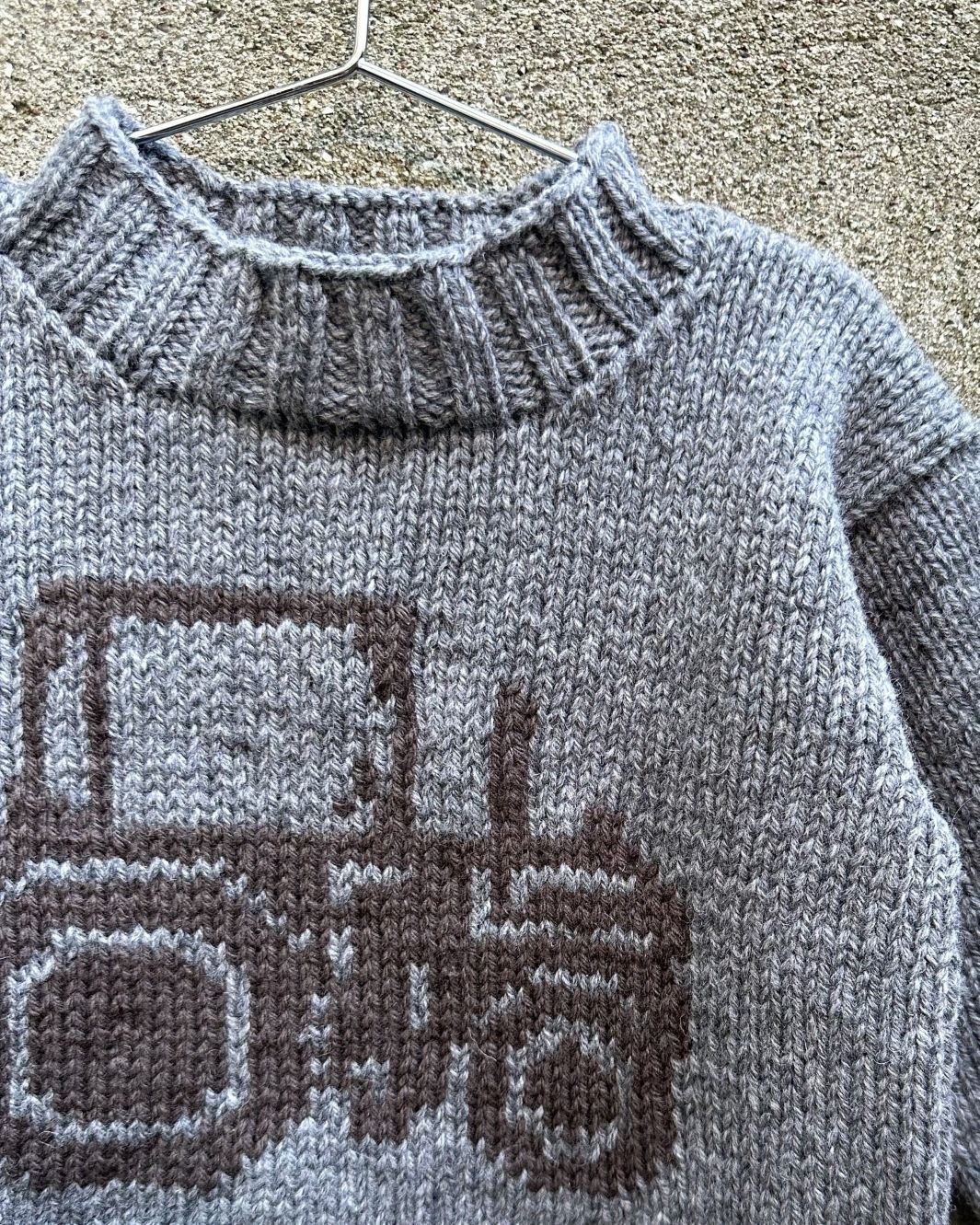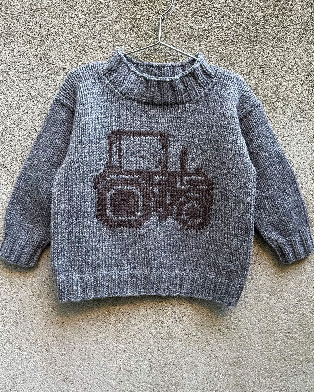 Traktor Sweater er en enkel basisgenser med et flott traktormotiv på forsiden, strikket i Heavy Merino.