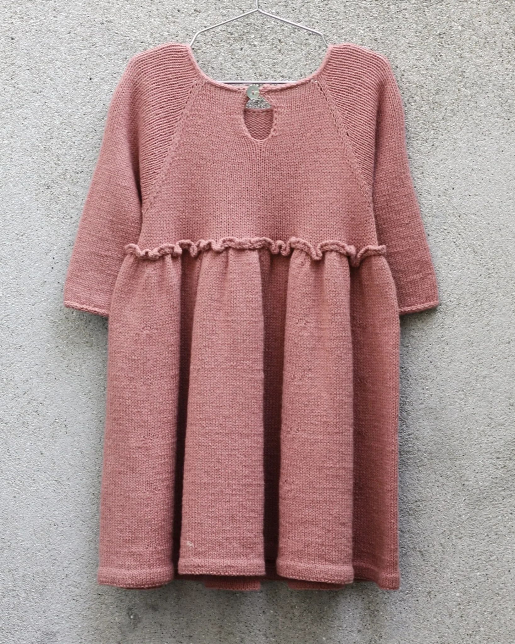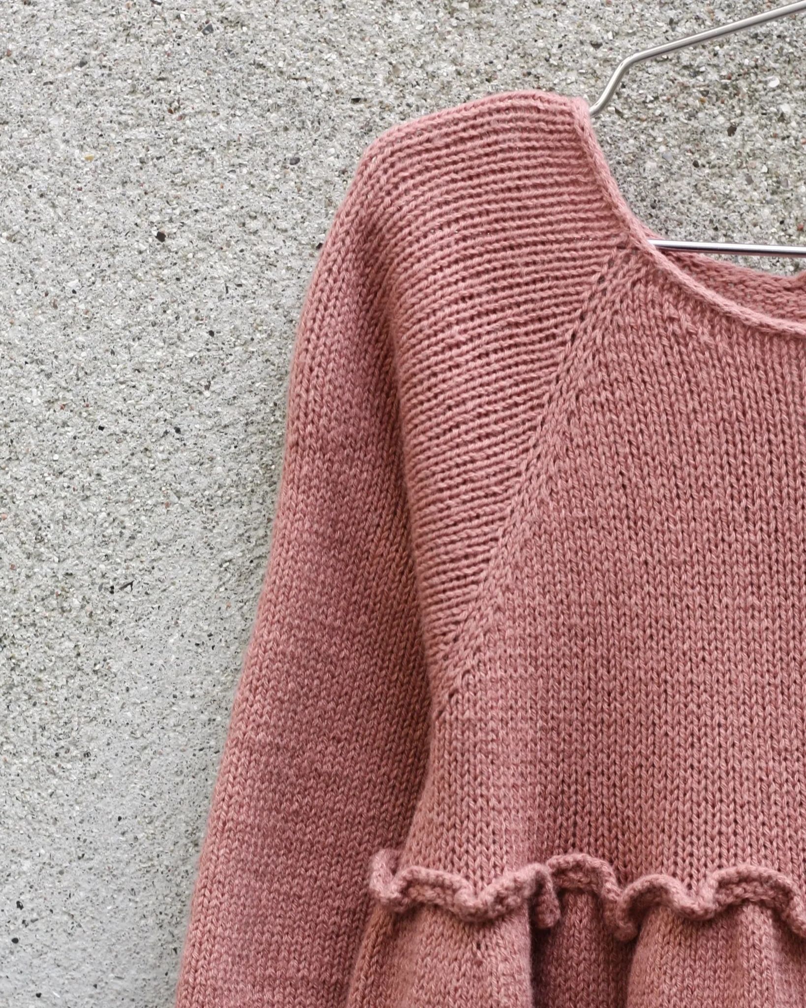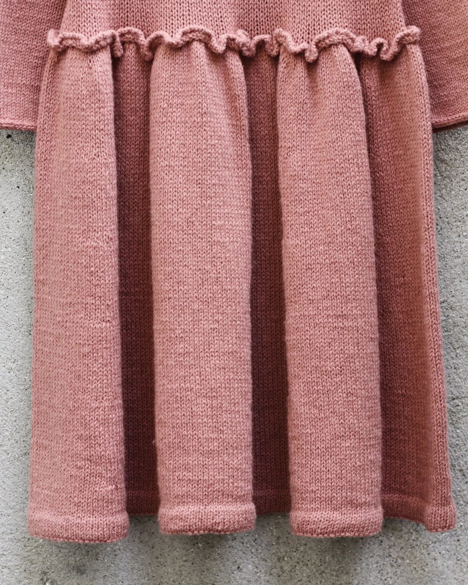 Volangen strikkes for seg og strikkes sammen med bærestykkets masker, deretter strikkes skjørt. Ermene er 3/4 lange og strikkes rundt på strømpepinner.