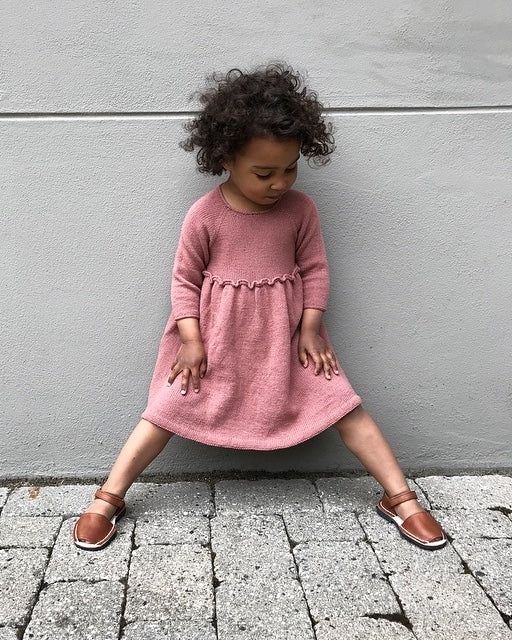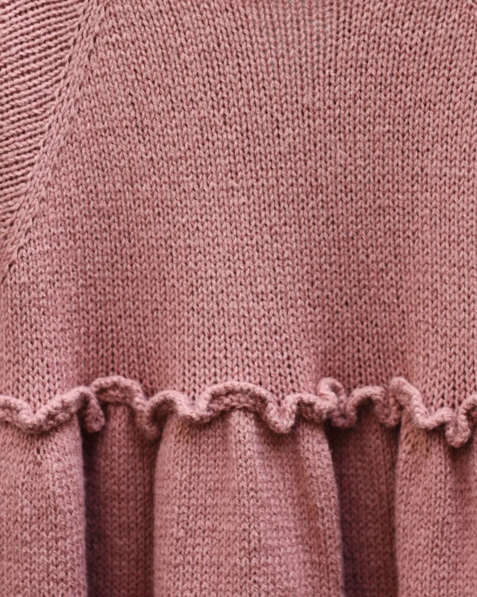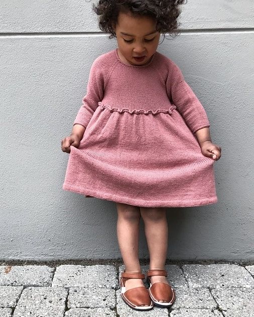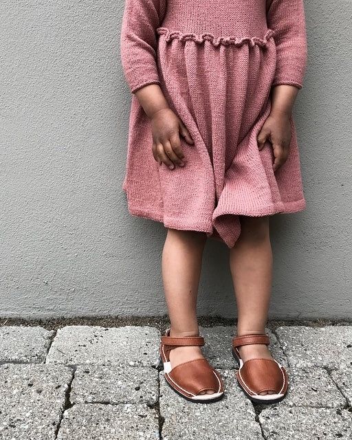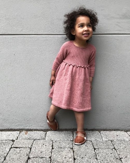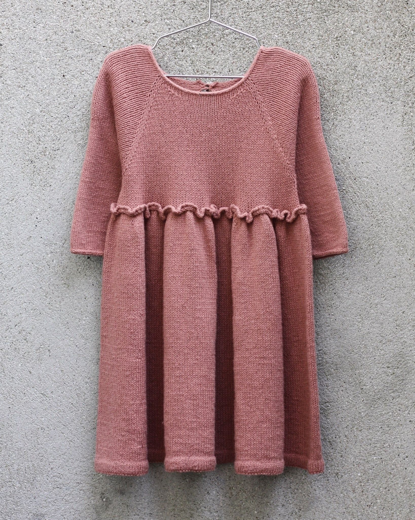 Volangen strikkes for seg og strikkes sammen med bærestykkets masker, deretter strikkes skjørt. Ermene er 3/4 lange og strikkes rundt på strømpepinner.