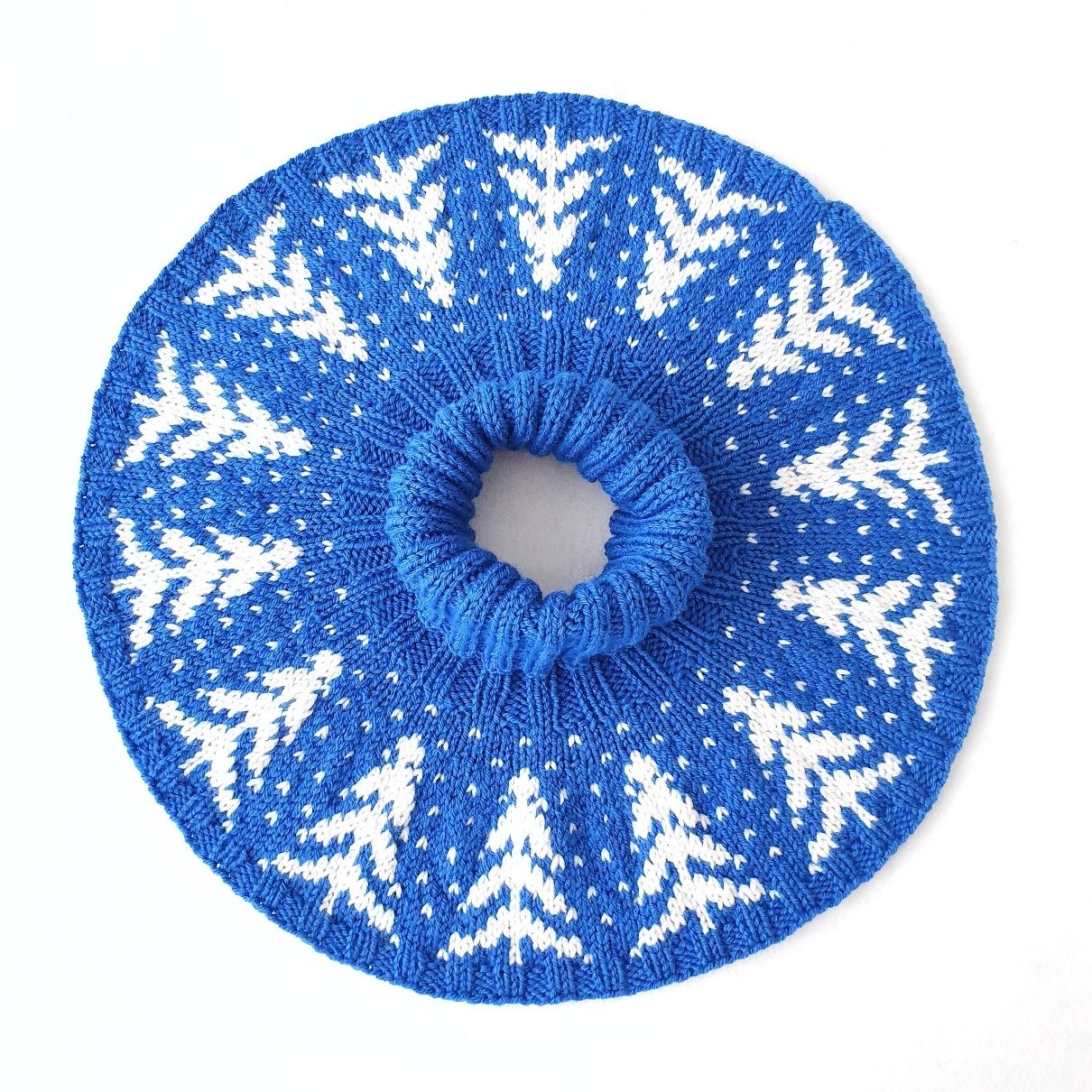 Vintergranhals-oppskriften fra Tonje i Oslo gir deg en rund hals med dobbelt faldbrett, dekorert med stilisert granmønster over skuldrene — strikkes ovenfra og ned og tilbys i barne- og voksenstørrelser.