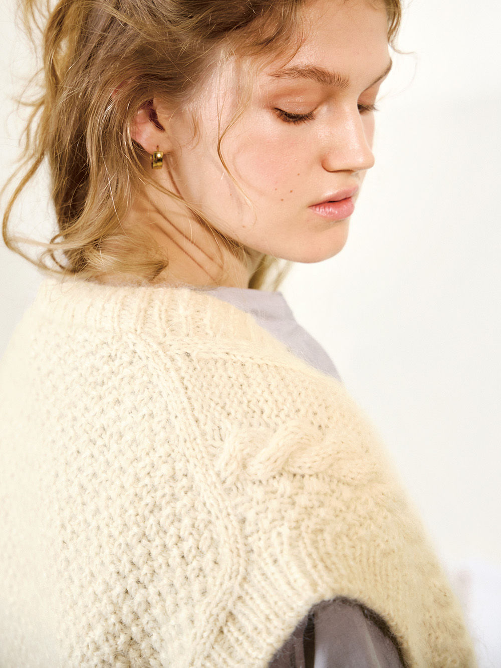 Vesten strikkes ovenfra og ned i Ballerina Chunky mohair og Kos.