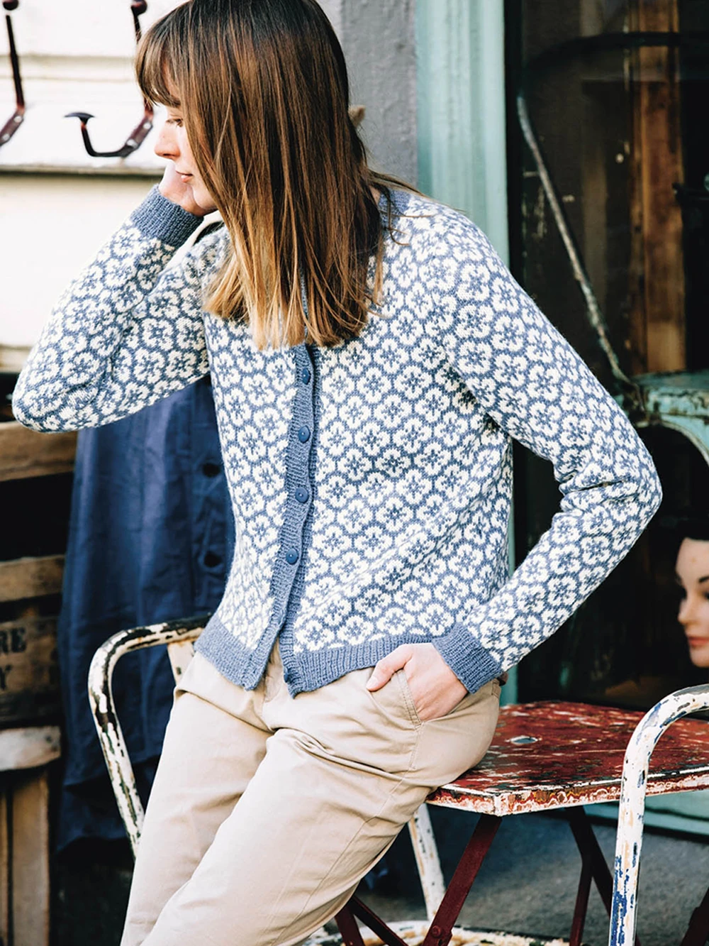 Jakke med blomster og ermetopp til dame, strikket i Sisu fra Sandnes Garn.
