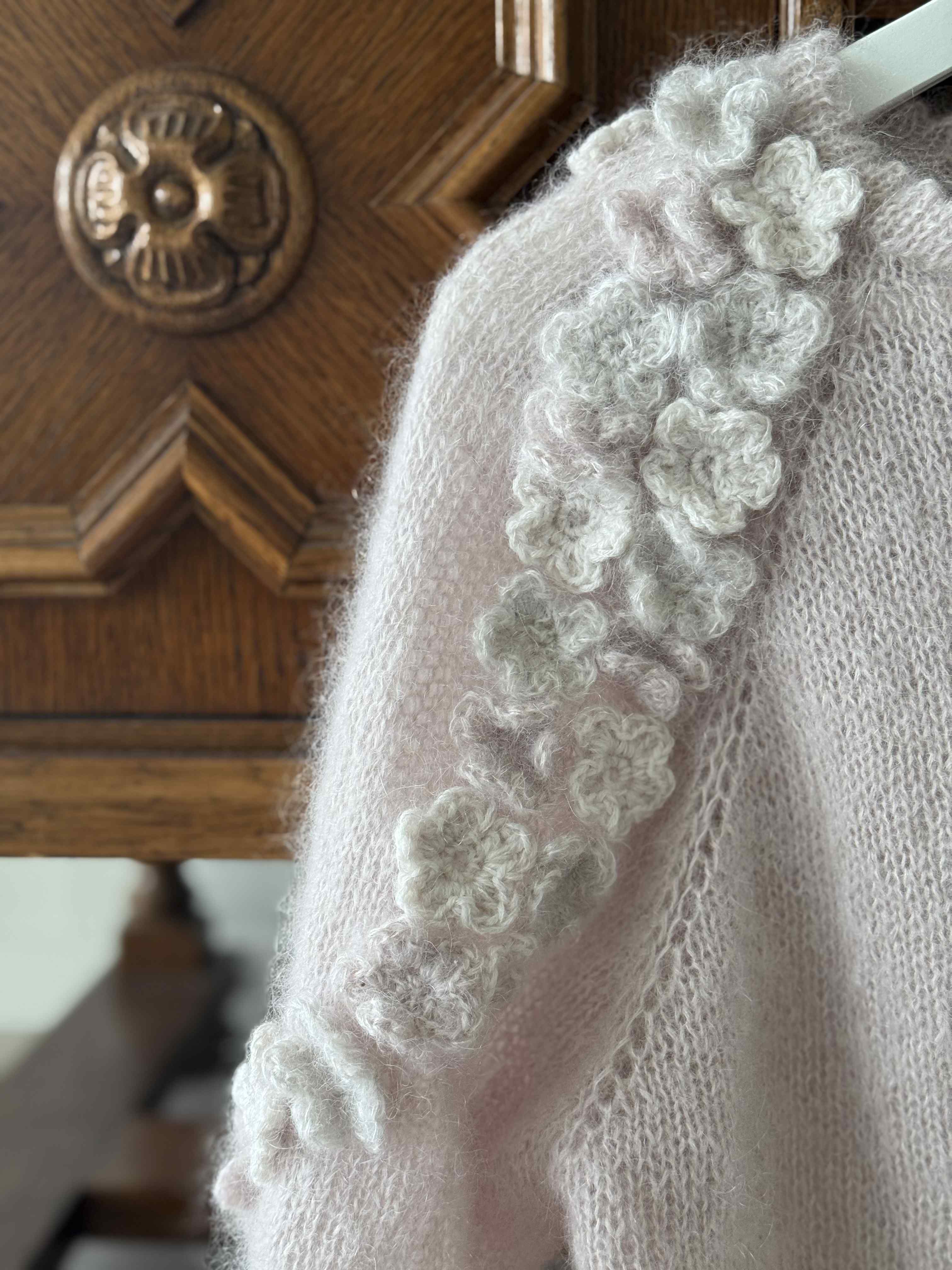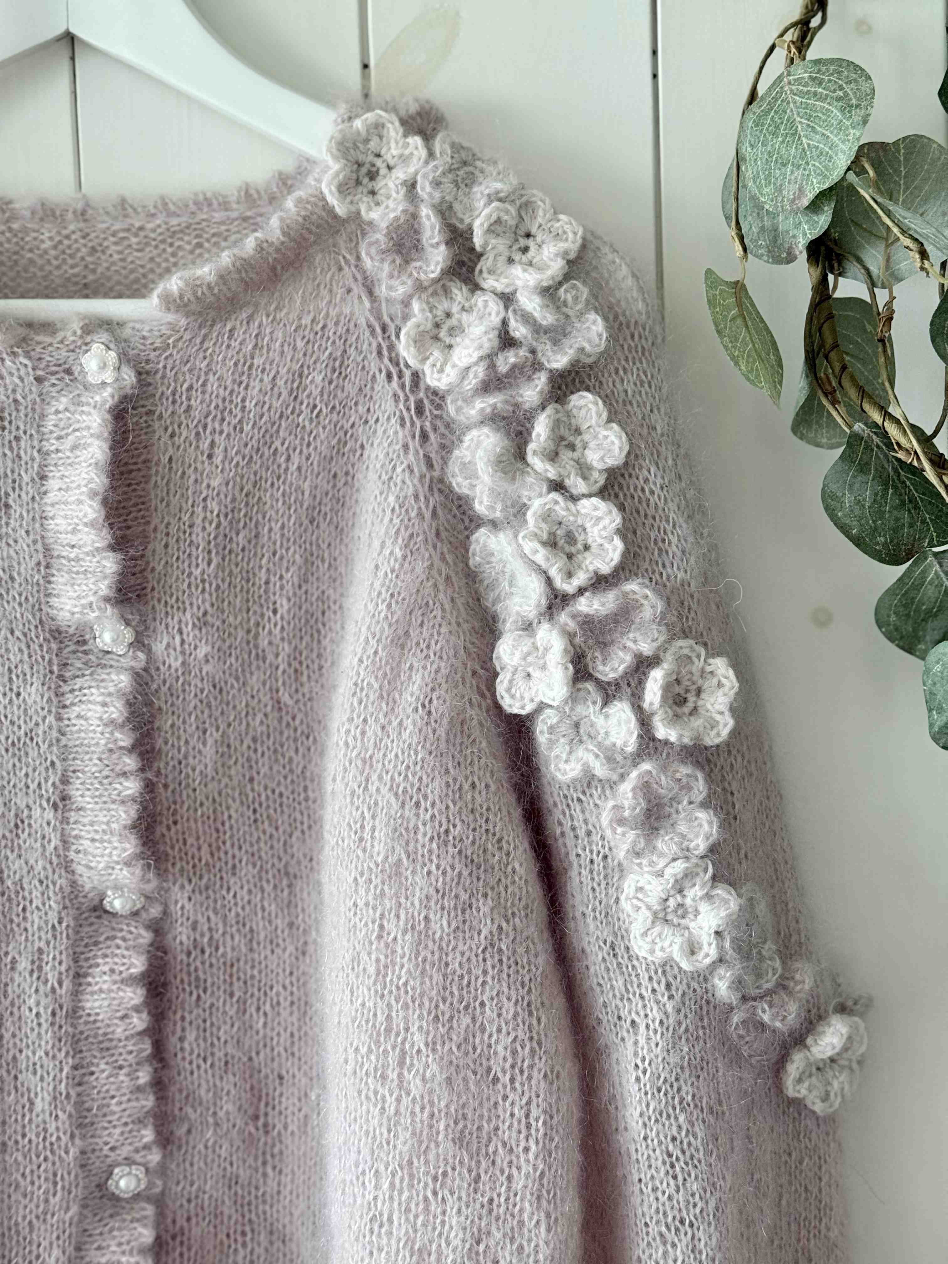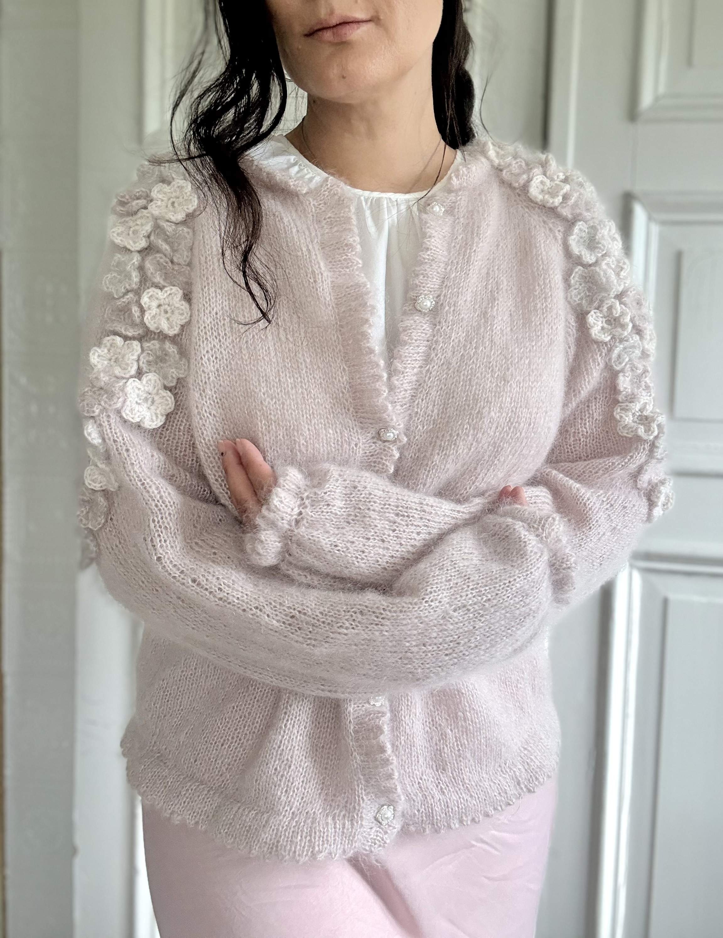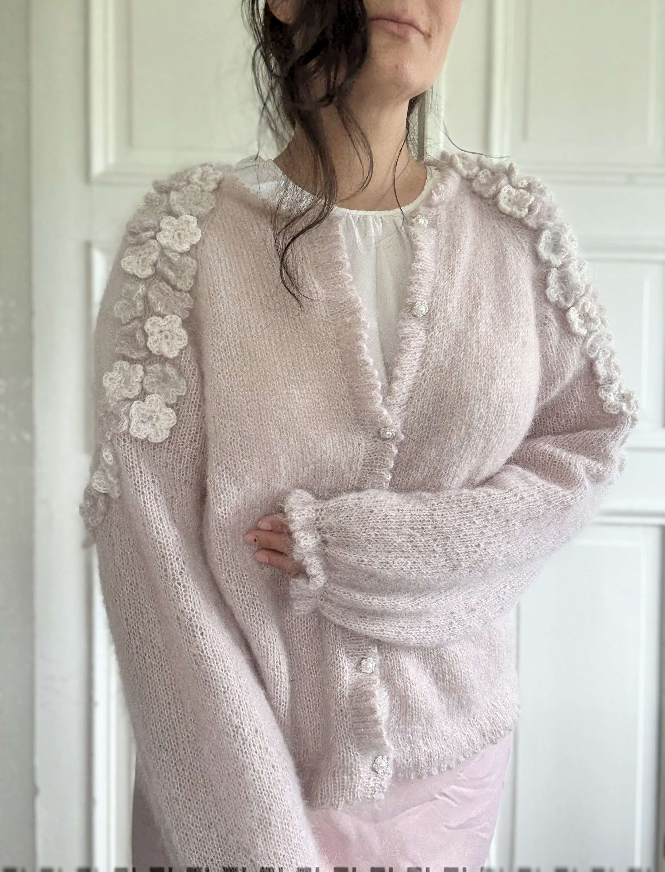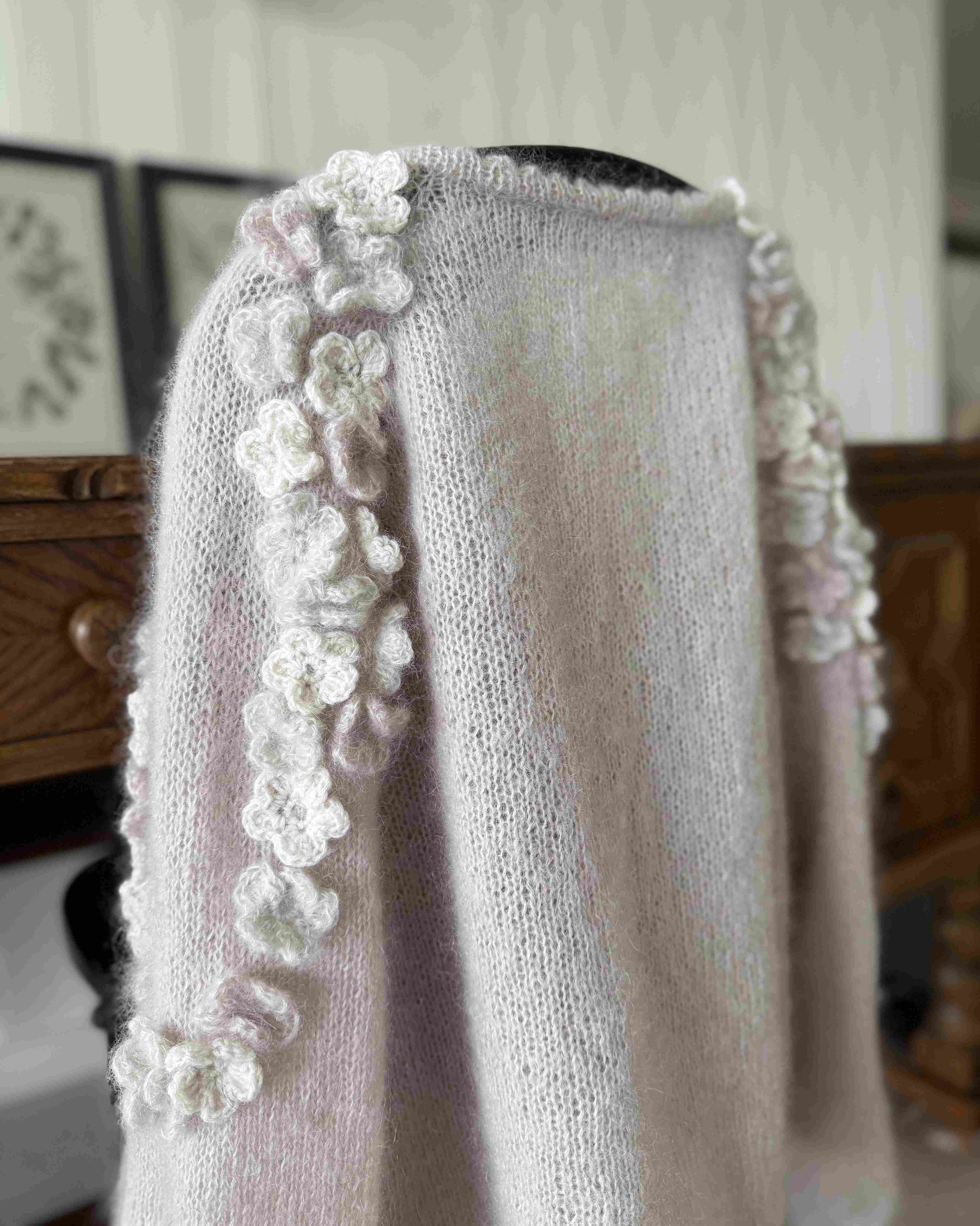 Cardiganen strikkes i dobbel tråd silk mohair på pinne 4 mm. Den strikkes ovenfra og ned, noe som gjør det enkelt å tilpasse lengden på både bol og ermer underveis. Du starter med halskanten, fortsetter med raglanøkninger langs skuldrene, og når arbeidet når underarmslengde skilles bol og ermer. Først strikkes bolen ferdig, deretter ermene rundt til ønsket lengde. Til slutt hekles og monteres blomstene langs skuldre og ermer.