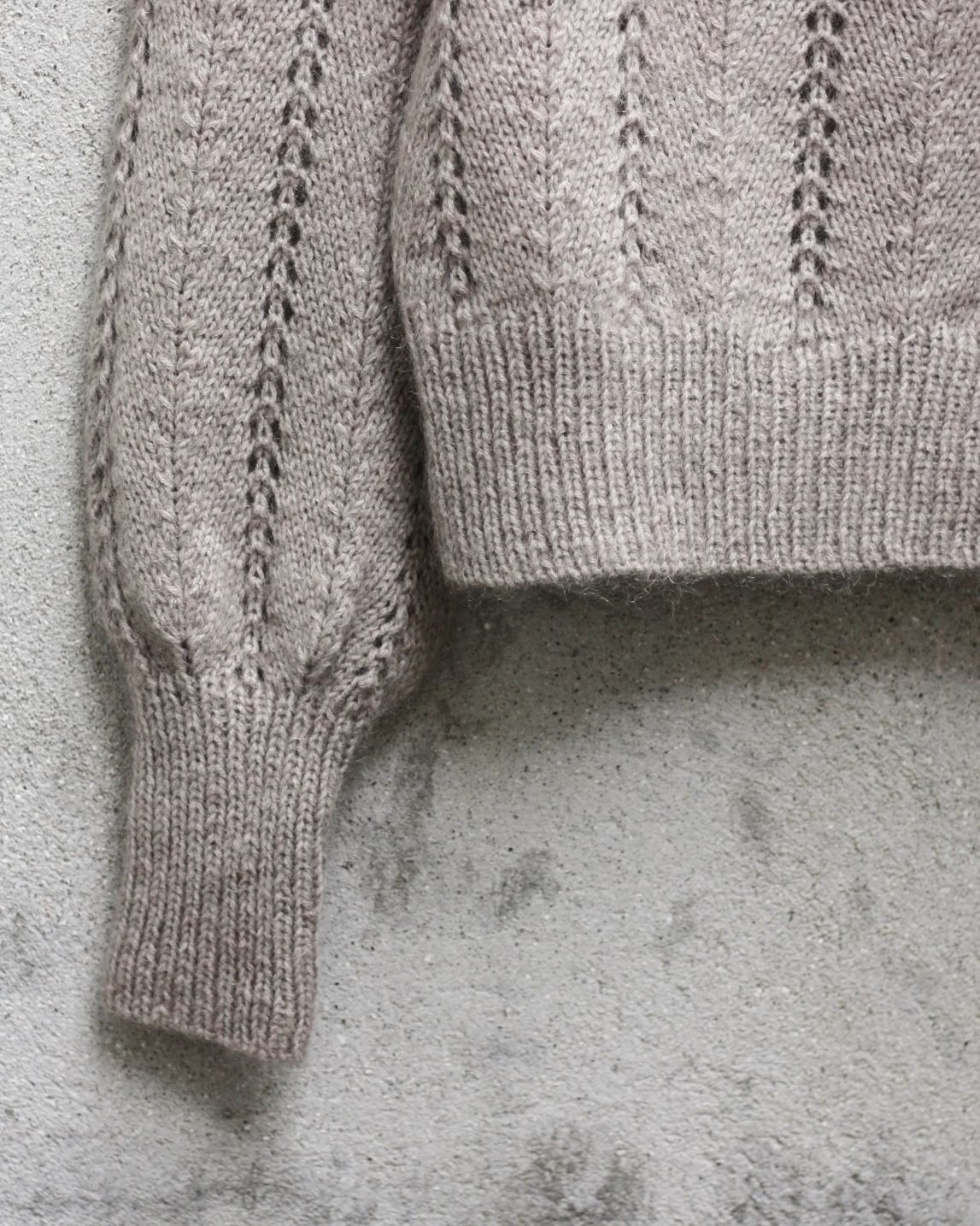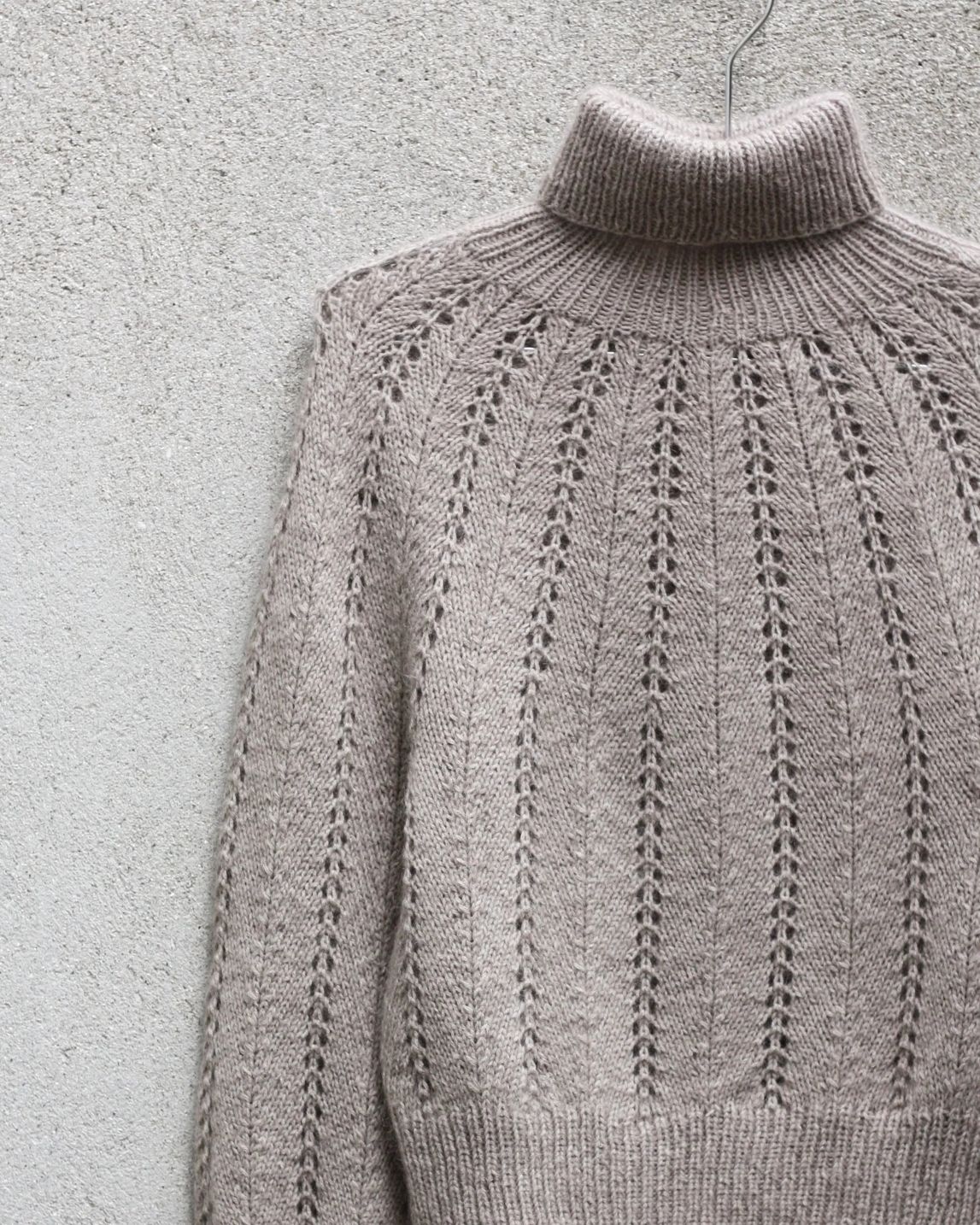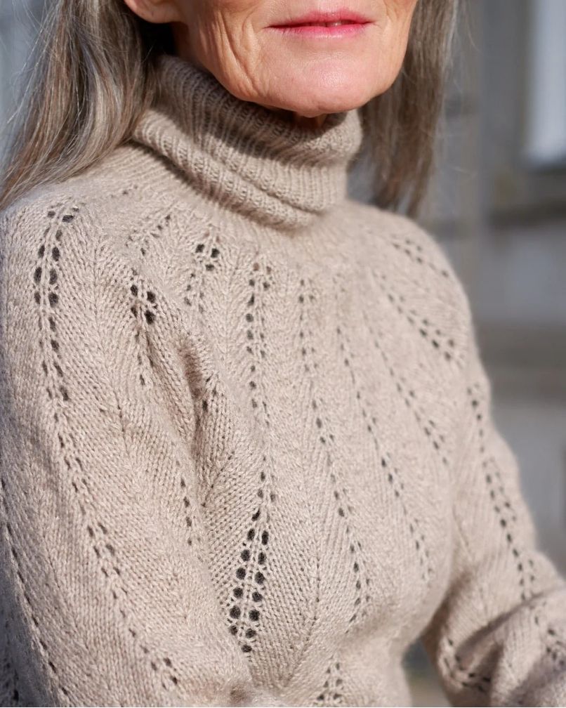 Genseren har en høy ribbhals og brede ribbkanter, som gir en rå kontrast til det feminine strukturmønsteret. Genseren strikkes rundt ovenfra og ned. Halsutskjæringen formes ved hjelp av vendestrikk, German Short Rows. Blusens hullmønster er enkelt og vanedannende å strikke.