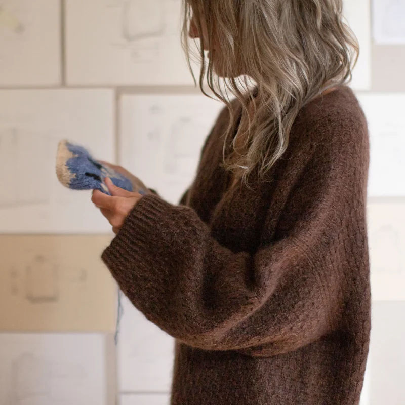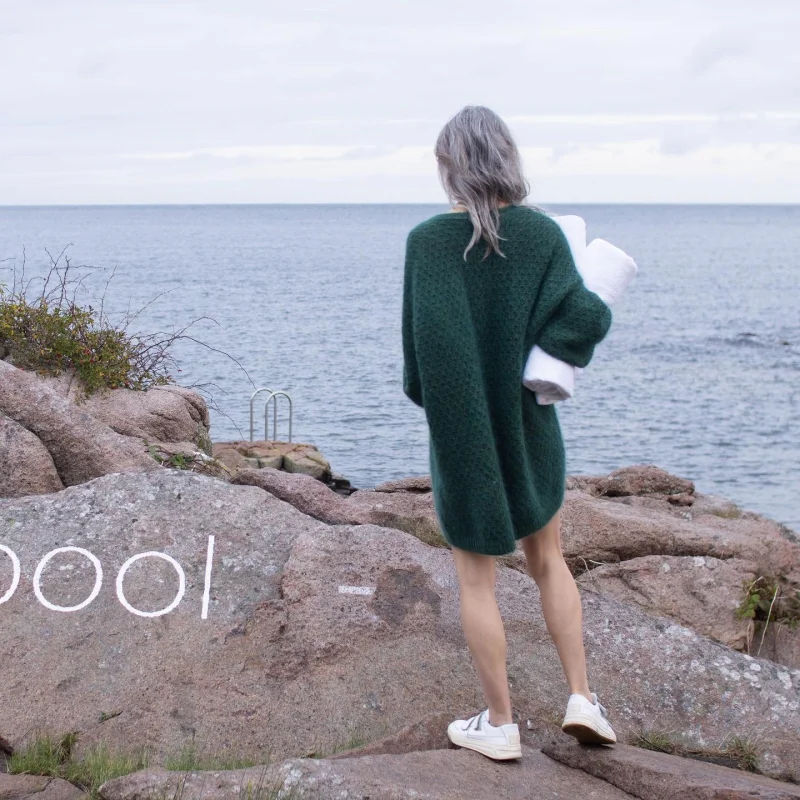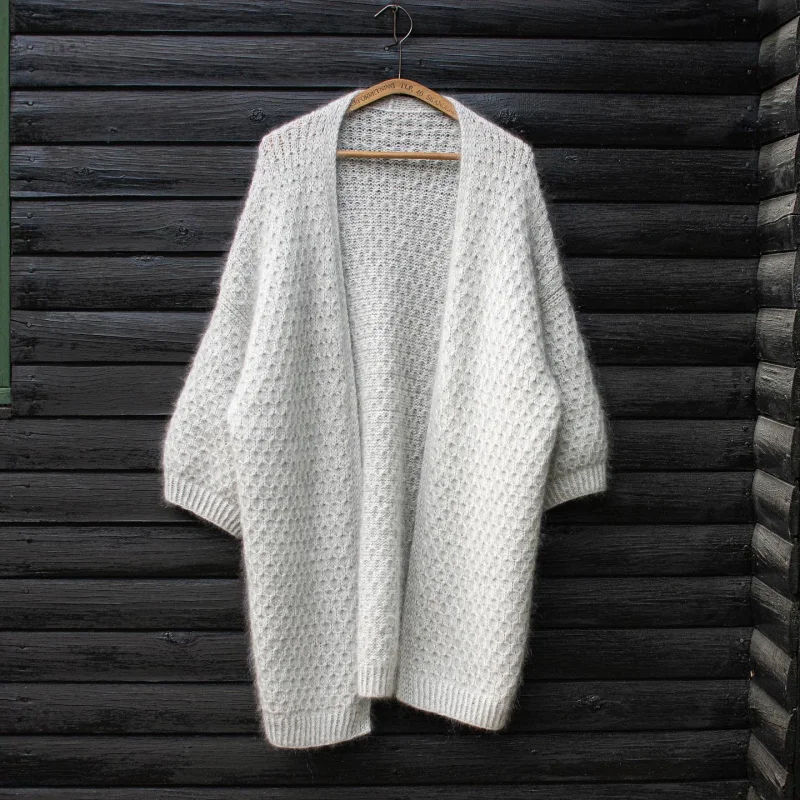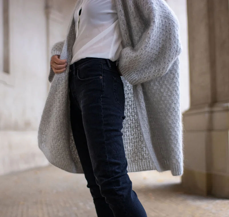 Cardi Cocoon er en myk og lun jakke med et enkelt, raffinert strukturmønster. Den strikkes ovenfra og ned: først halskant og bærestykke, deretter skuldre og forstykker, før bolen strikkes i ett stykke. Til slutt strikkes ermene på rundpinne for en pen og sømløs finish.