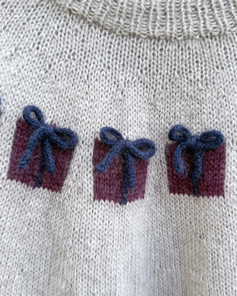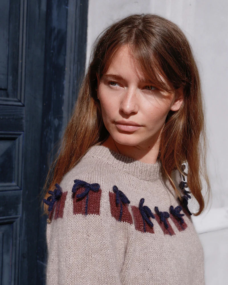 Christmas Morning Sweater er en del av Knitting for Olives 2025 Christmas-kolleksjon. Genseren er en morsom og leken julegenser med små gaver med i-cord-sløyfer rundt bærestykket. Den strikkes med 1 tråd merino + 1 tråd Soft Silk Mohair som holdes sammen hele veien. Du kan skape det uttrykket du ønsker gjennom fargevalgene dine. Velg dype og klassiske julefarger hvis du vil ha en genser som oser av jul, eller velg lyse og lekne farger hvis du foretrekker en mer utradisjonell julegenser.