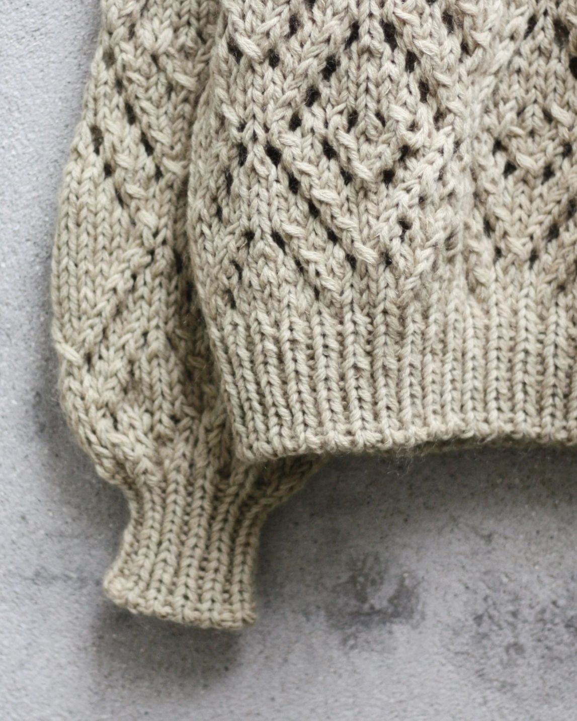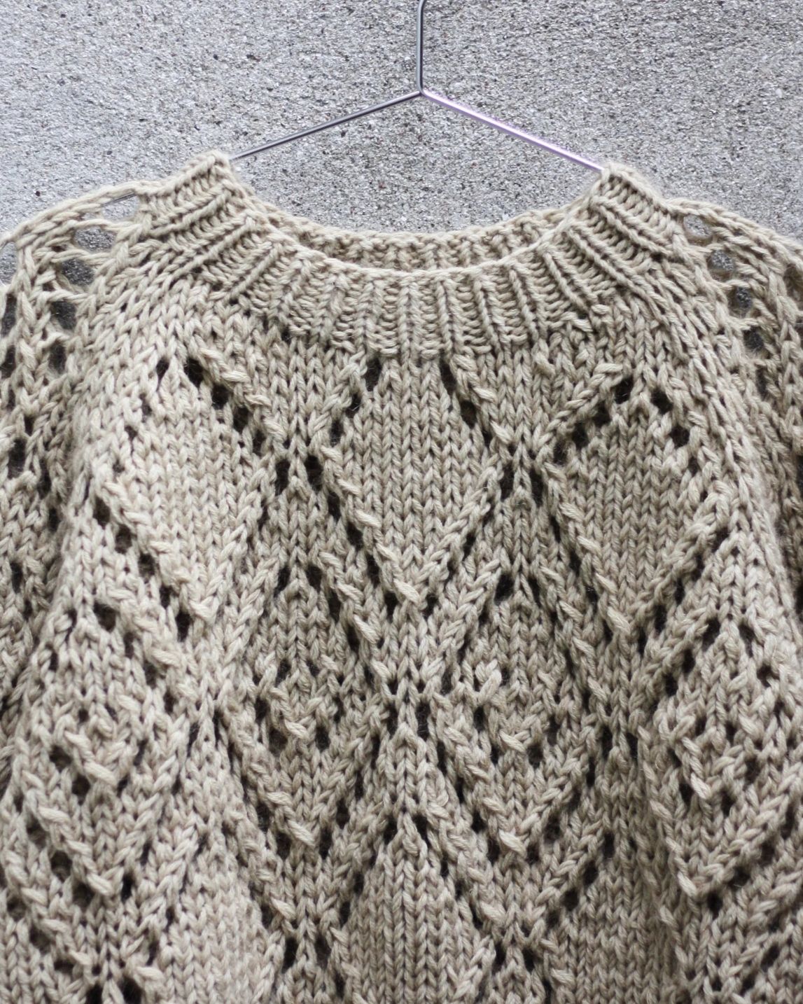 Clotilde Sweater er en myk og chunky genser med et grafisk hullmønster. Genseren strikkes i en tråd Heavy merino og en tråd soft silk mohair.