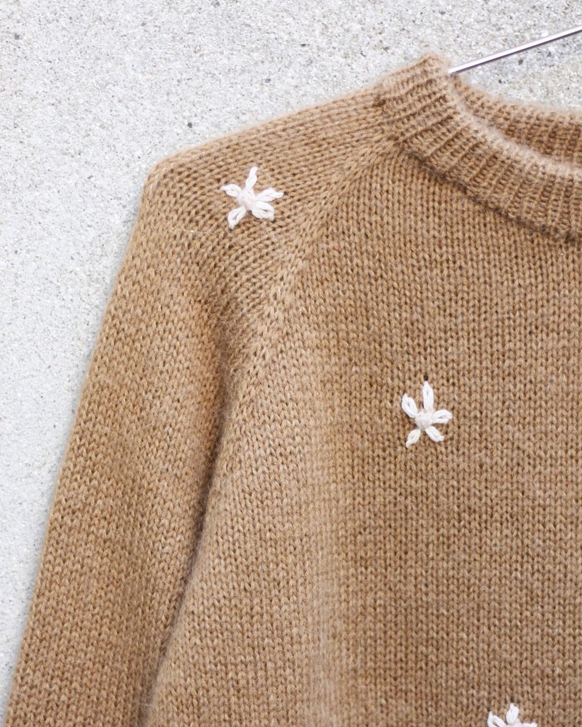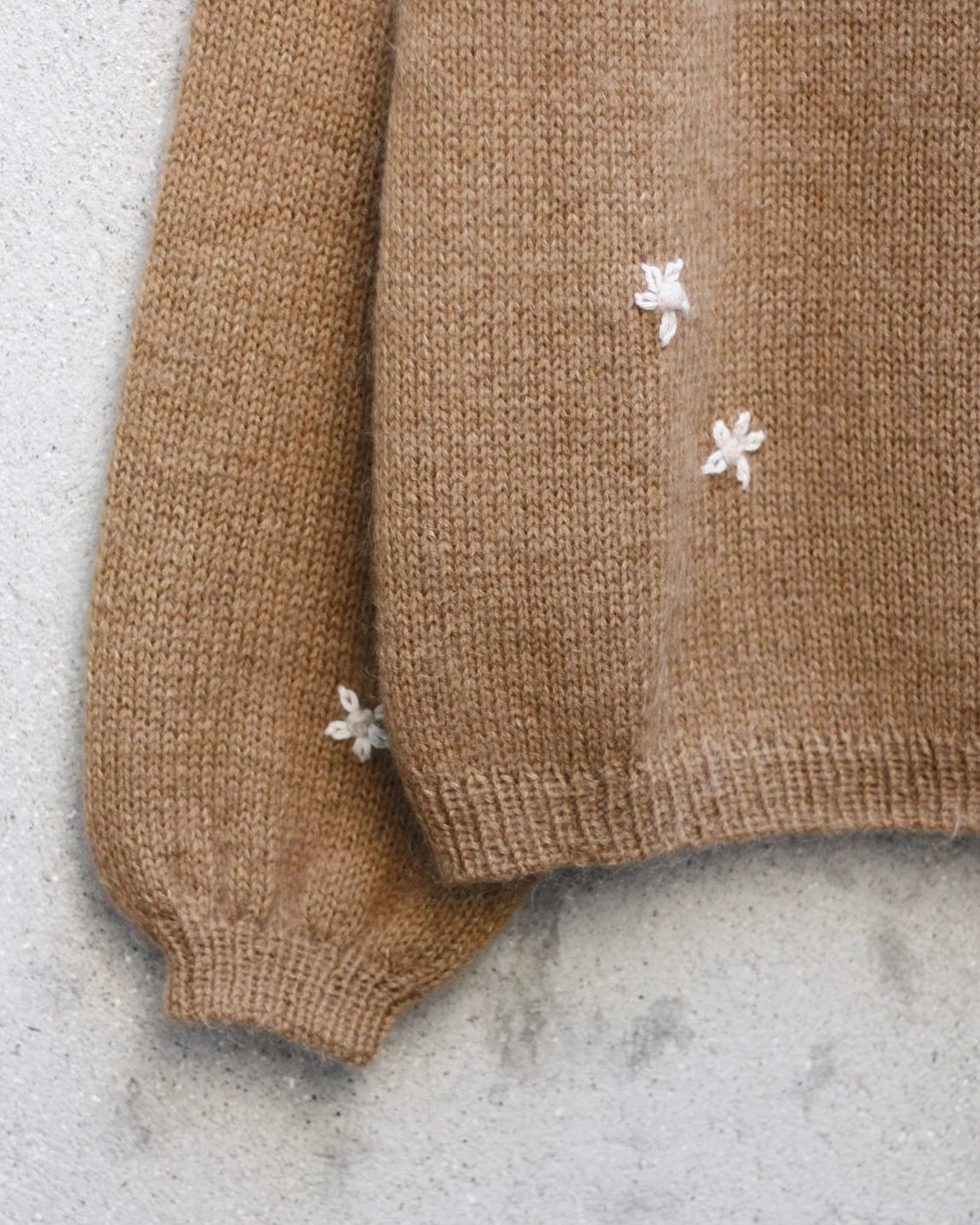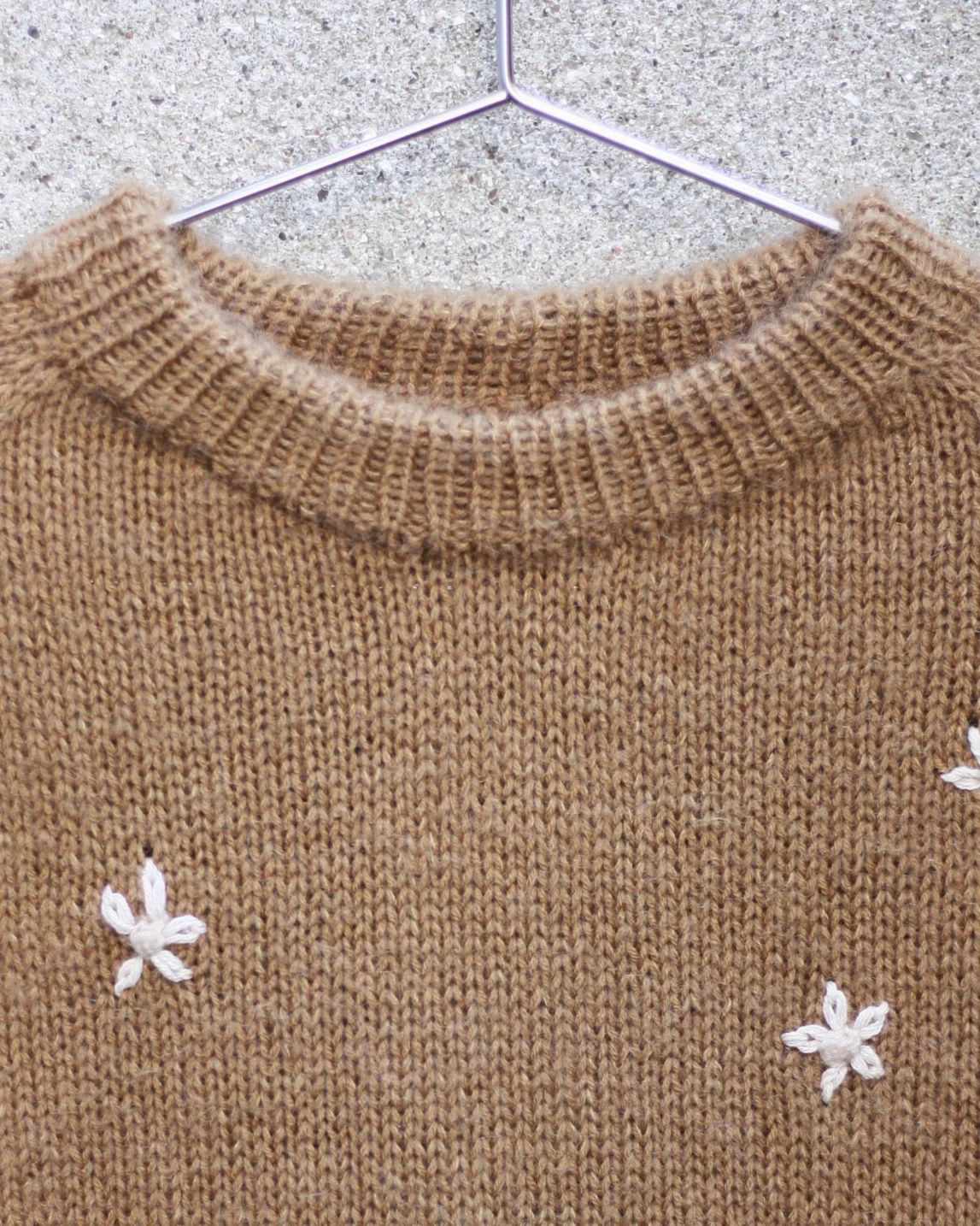 Genseren på bilde er Strikket i størrelse M i Merino - Kamel og Soft Silk Mohair - Karamel. Blomsterknoppene er Strikket i Merino - Pudder og bladene er brodert i Pure Silk - Kit