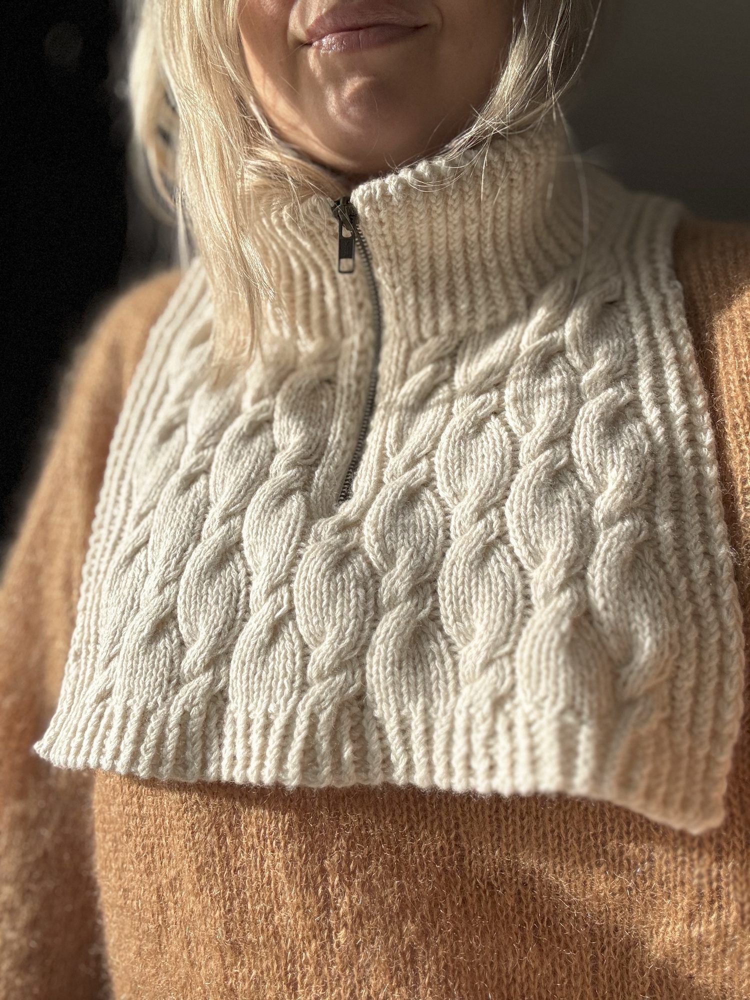 Halsen strikkes med nydelig strukturstrikk og flettedetaljer. Glidelåsen sys inn med belegg for en ekstra gjennomført finish. Et smart og lekkert tilskudd til høst- og vintergarderoben, enten til deg selv eller som gave!