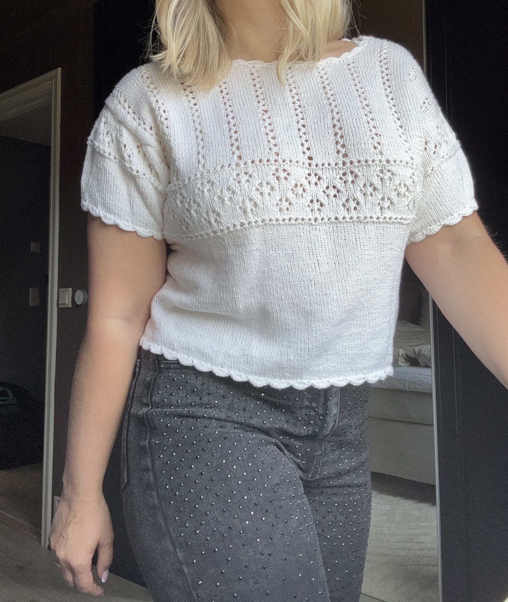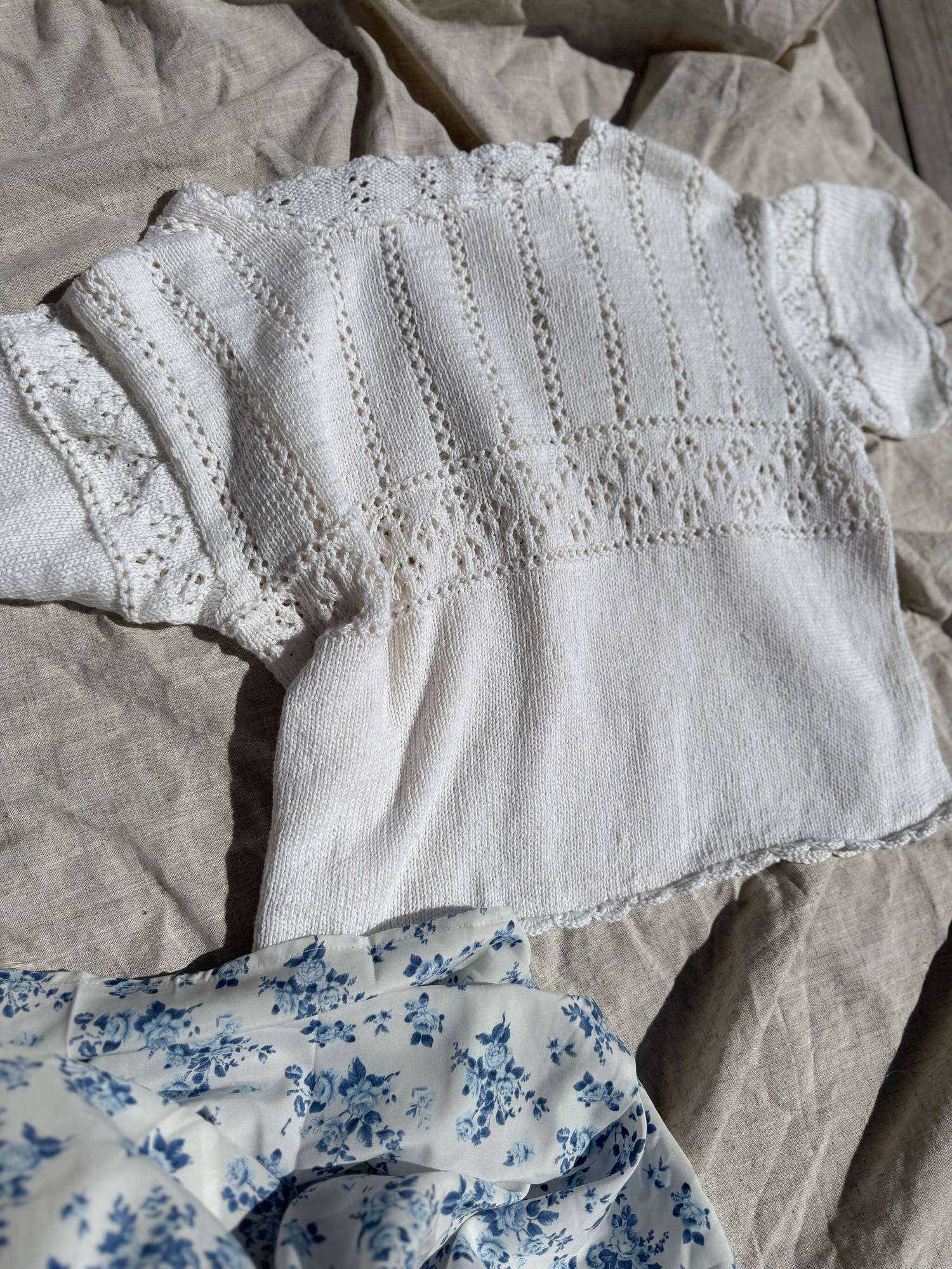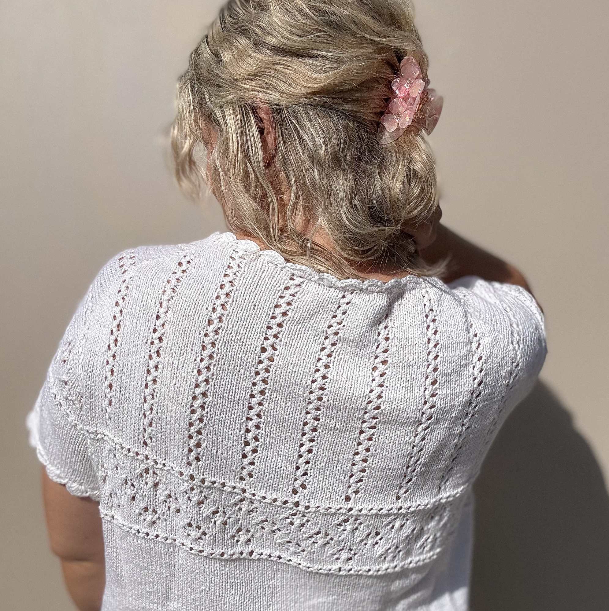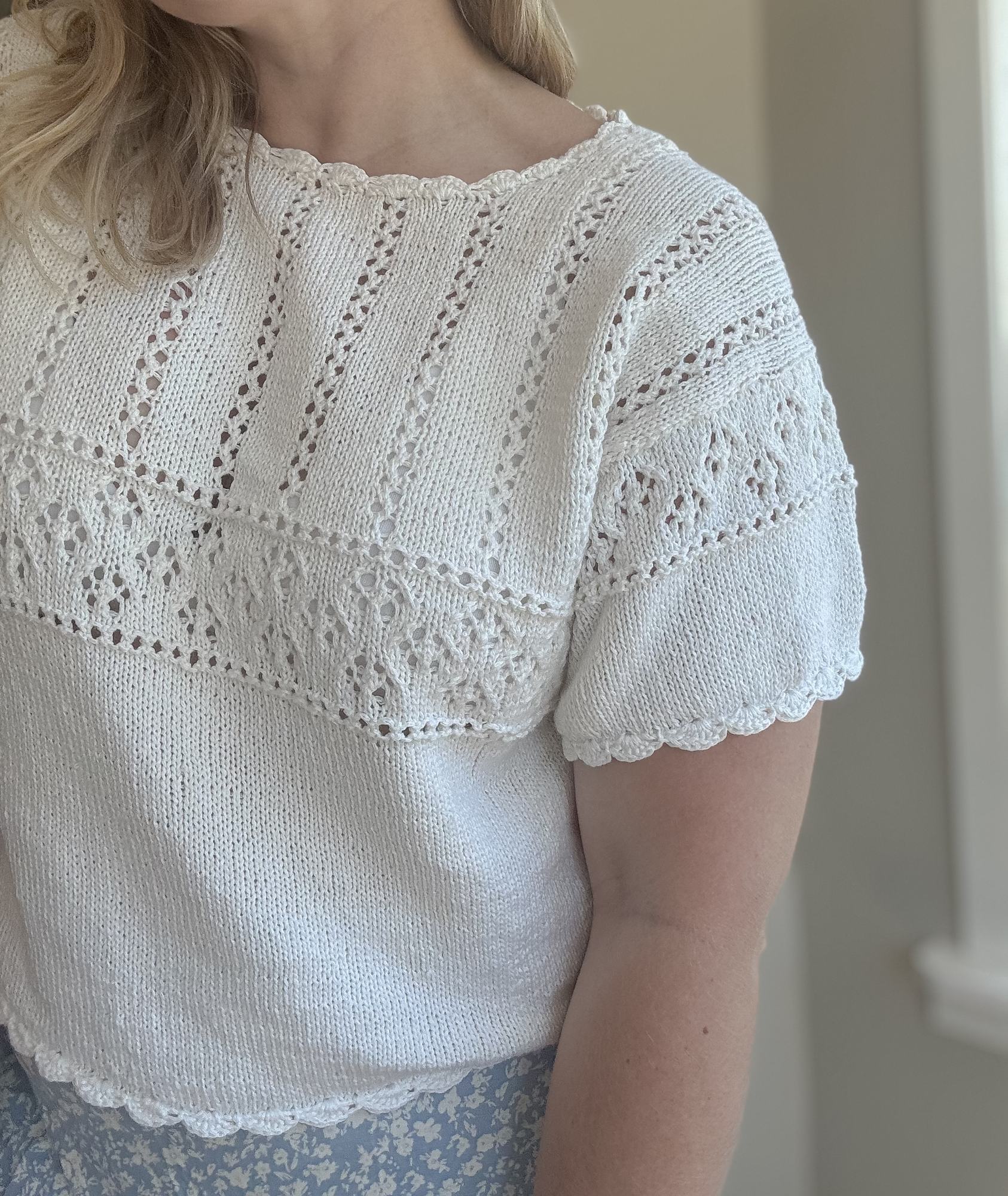 Eldora Tee fra Minegleder er en lett og romantisk sommertopp med delikate blondedetaljer og heklet avslutning. Toppen strikkes i strukturrikt mønster med nydelige linjer og heklekant rundt hals, ermer og bol. Med sin vintage-inspirerte stil og luftige design er denne perfekt til varme dager – både til jeans og skjørt.