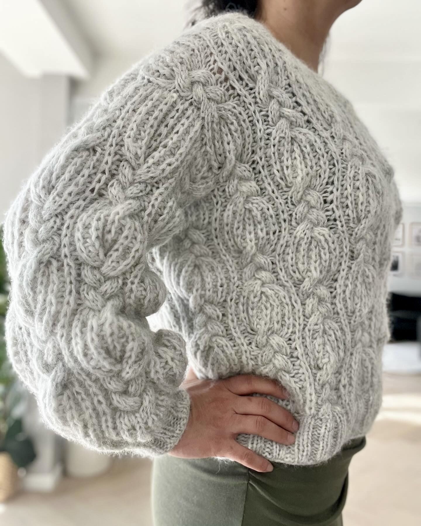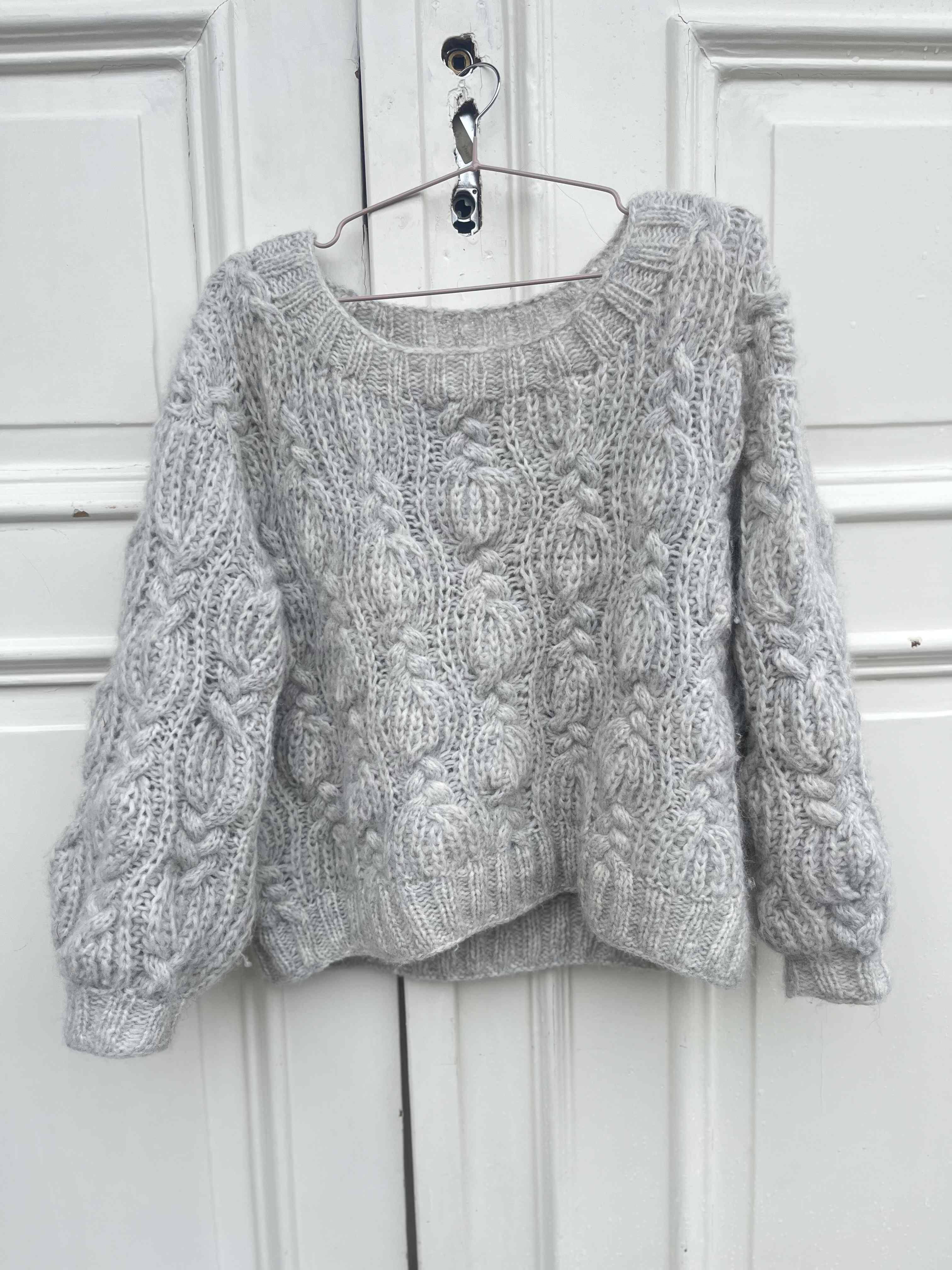 Genseren strikkes nedenfra og opp i en mønsterkombinasjon av patentmasker og fletter.