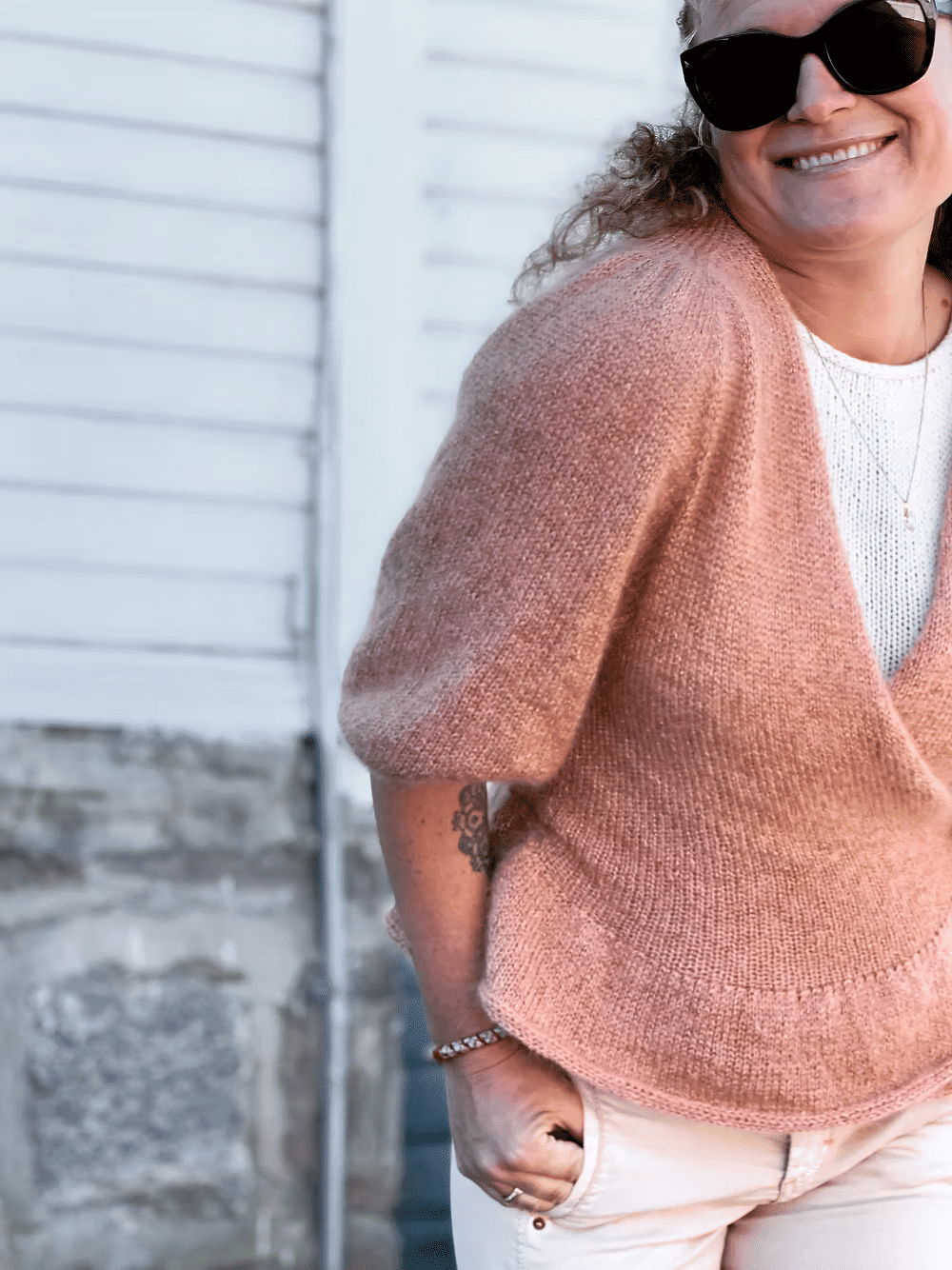 Nydelig omslagsjakke, fin til både fest og hverdag. Strikk den med en glittertråd for en kul effekt.