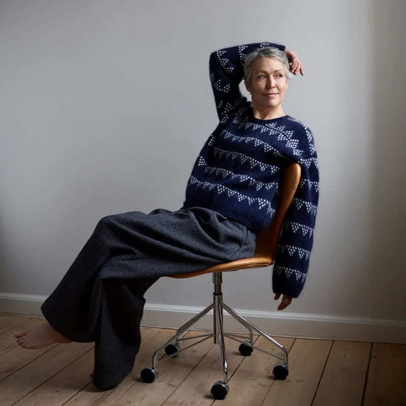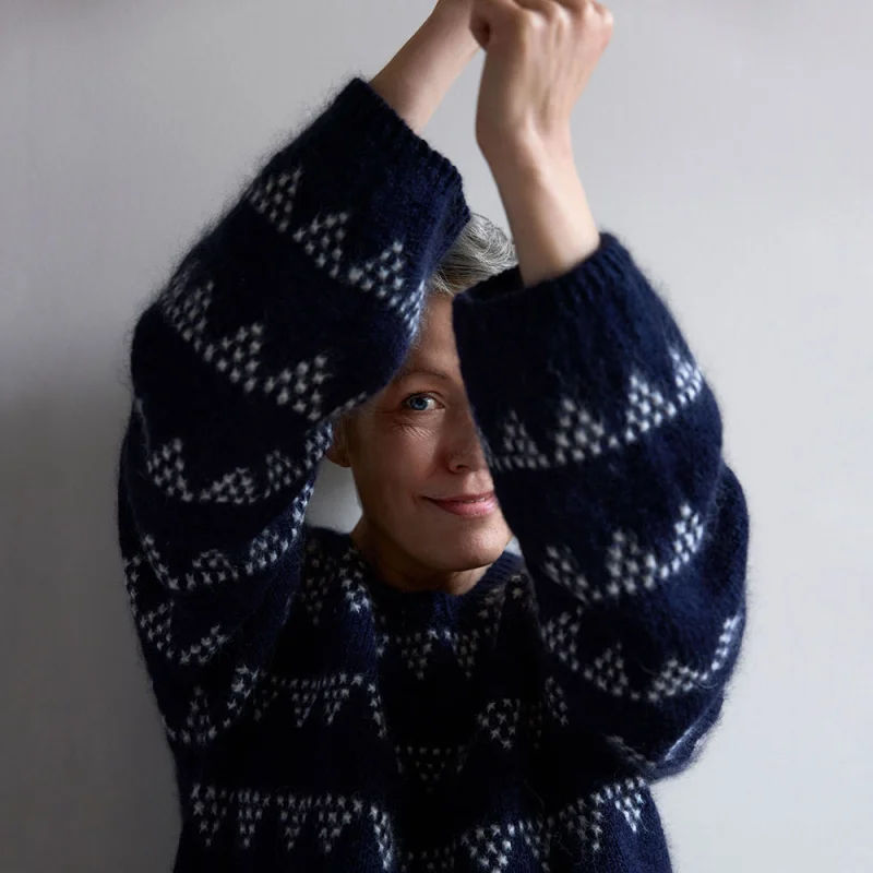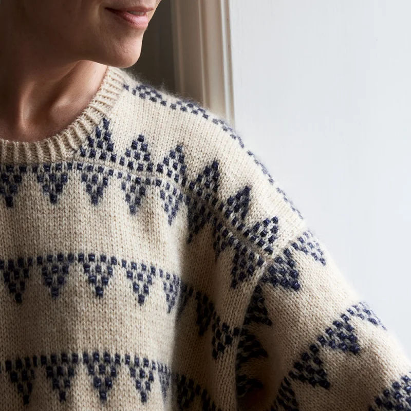 Grape and Gramma er en moderne genser strikket i glattstrikk med et karakteristisk mønster i vevstrikk. Vevstrikk gir et flerfarget uttrykk, men strikkes med én farge av gangen – perfekt for deg som vil ha effekten uten avansert teknikk. Genseren strikkes ovenfra og ned, er monteringsfri og formes med forkortede pinner for en god passform.