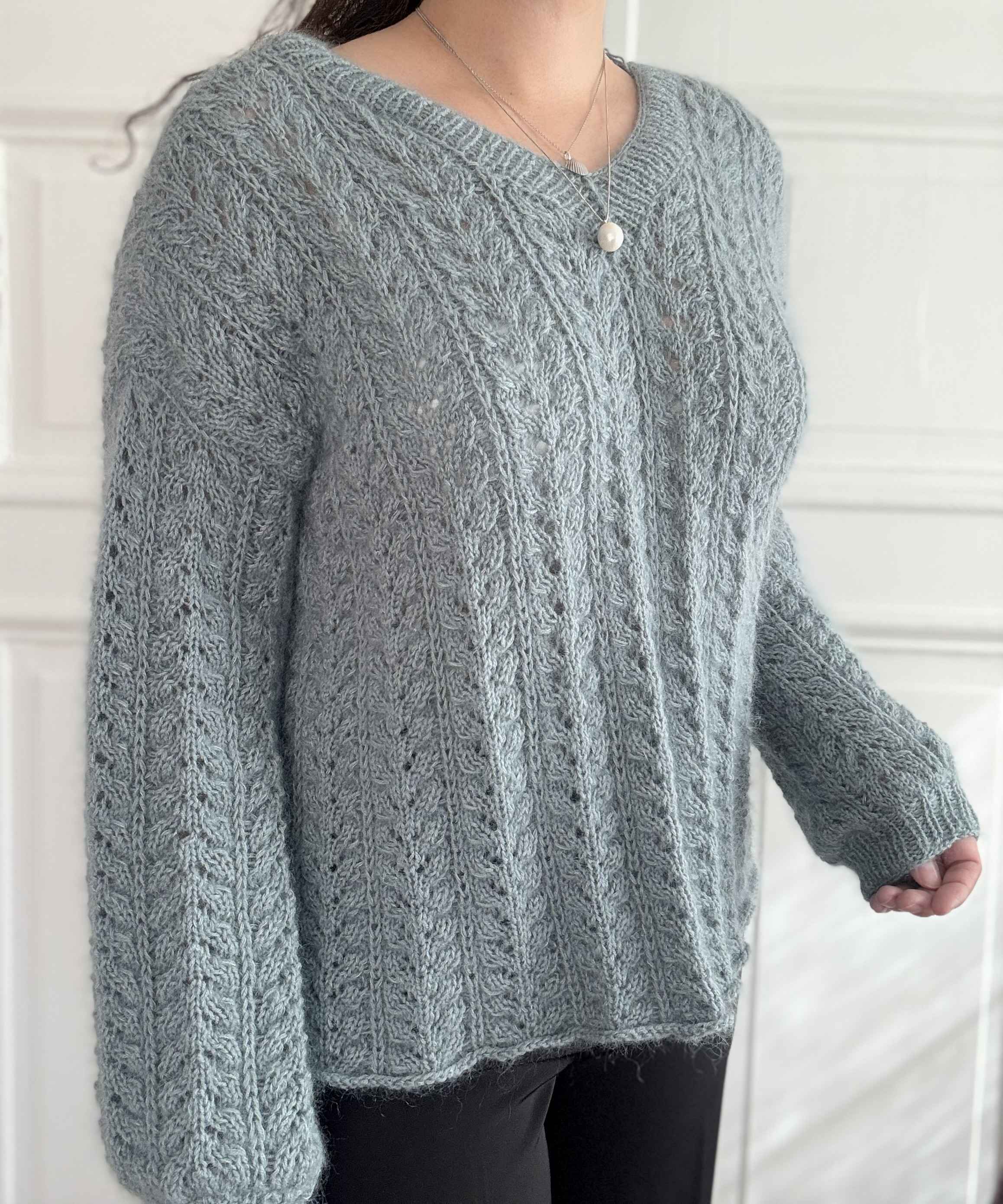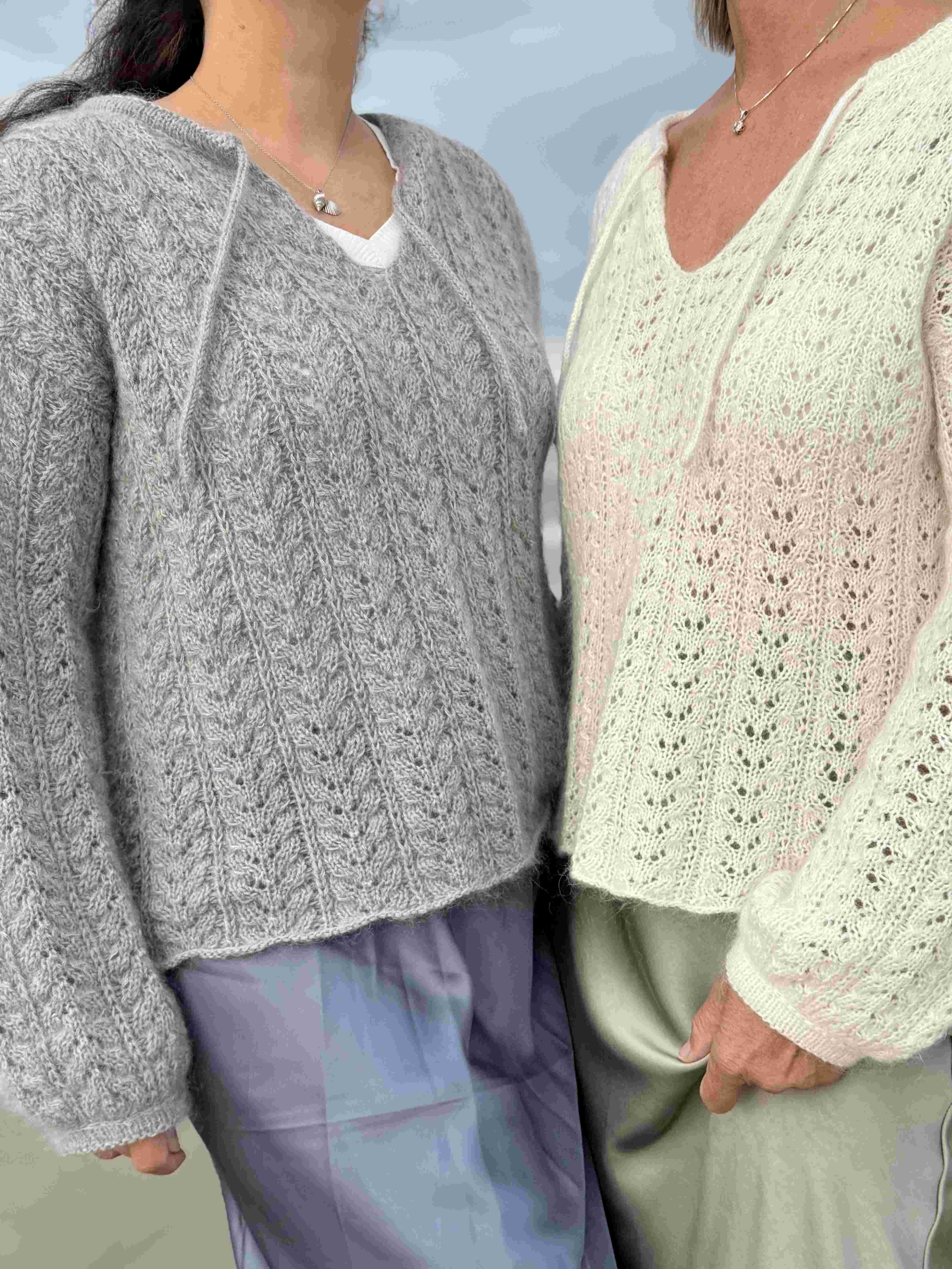 Genseren strikkes i én tråd silk mohair og én tråd merino på pinne 4 mm. Bolen strikkes rundt nedenfra og opp, før for- og bakstykket deles og fullføres frem og tilbake hver for seg. Deretter plukkes det opp masker til ermer fra ermehullene. Disse strikkes ovenfra og ned slik at ermelengden enkelt kan justeres. Oppskriften gir deg valget mellom to halsvarianter: en klassisk V-hals eller en nøkkelhullsåpning med snorer og knyting i front.