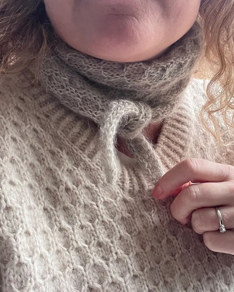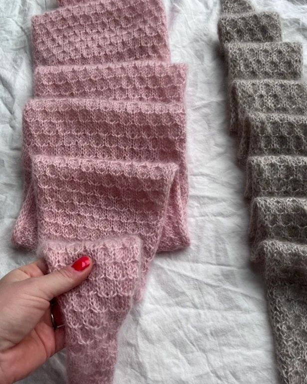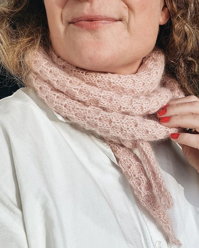 Alle typer tynn silk mohair kan brukes eller annen type tynn følgetråd som Alpakka følgetråd fra Sandes Garn. Strikk skjerfet gjerne sammen med Sunday fra Sandnes Garn. Evt dobbel tynn Silk Mohair.