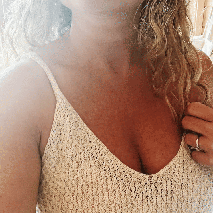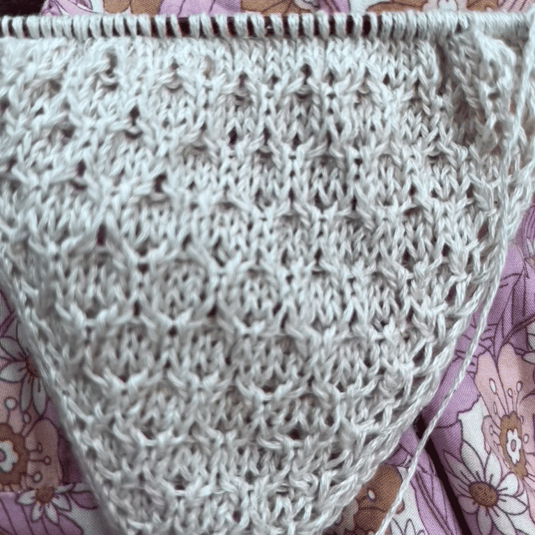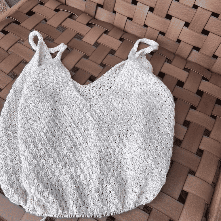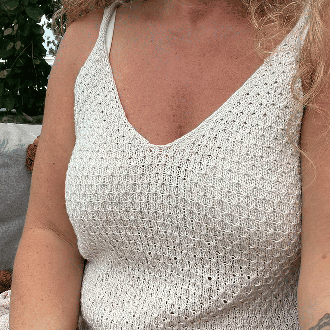 Toppen strikkes ovenfra og ned i strukturstrikk. Først strikkes det 4 like trekanter og deretter sammenføyes trekantene og det strikkes rundt til ønsket lengde. Bolen avsluttes med en fin i-cord avfelling. Helt til slutt strikkes stroppene som maskes fint sammen nederst på bakstykket.