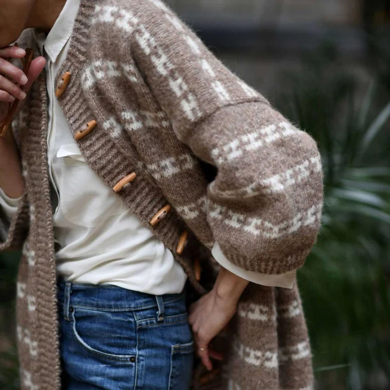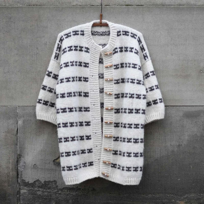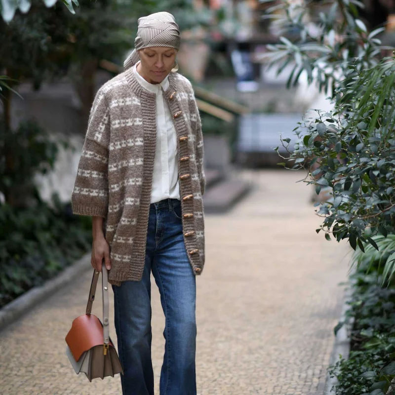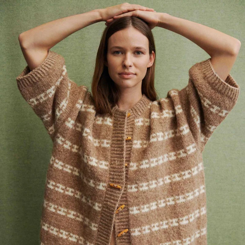 Karla Cape er en moderne, romslig cardigan inspirert av Isager Archives og Åse Lund Jensens strikk fra 50–70-tallet. Den strikkes ovenfra og ned i vevstrikk, som gir et flerfarget uttrykk med bare én farge av gangen. Jakken er monteringsfri og formes med forkortede pinner for god passform, med alle kanter i vridd ribb og italiensk avfelling for en pen avslutning.