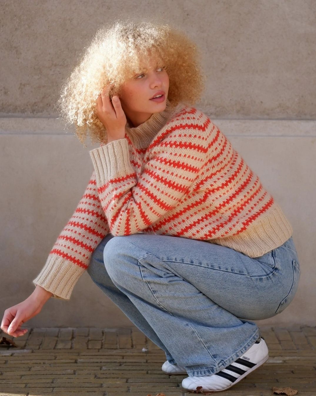 Modellen på bildet er strikket i Hvede (farge 1) og Blodappelsin (farge 2)