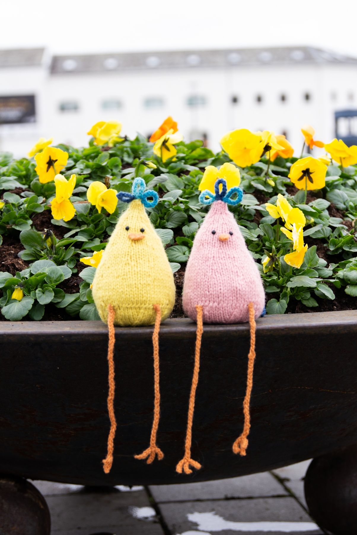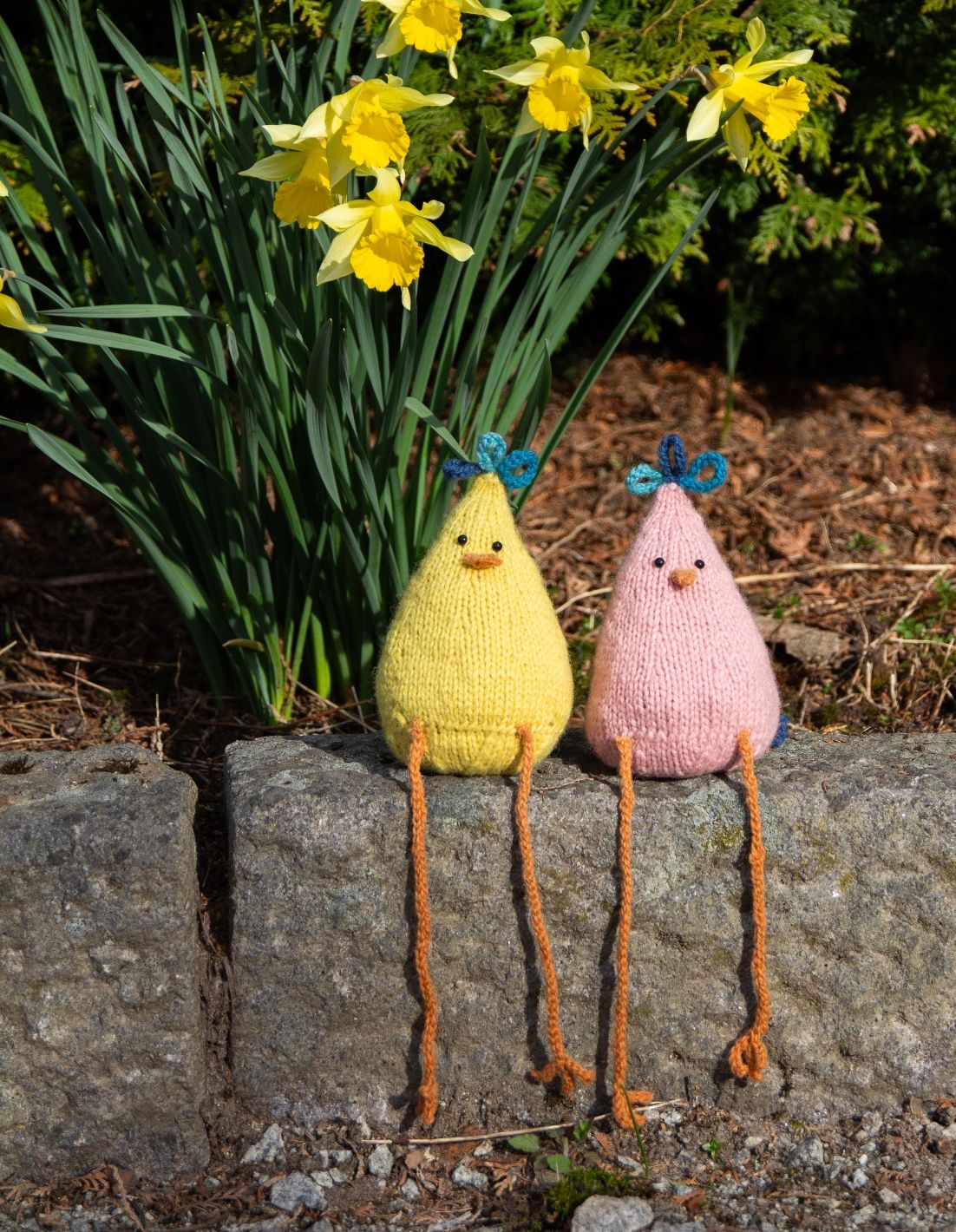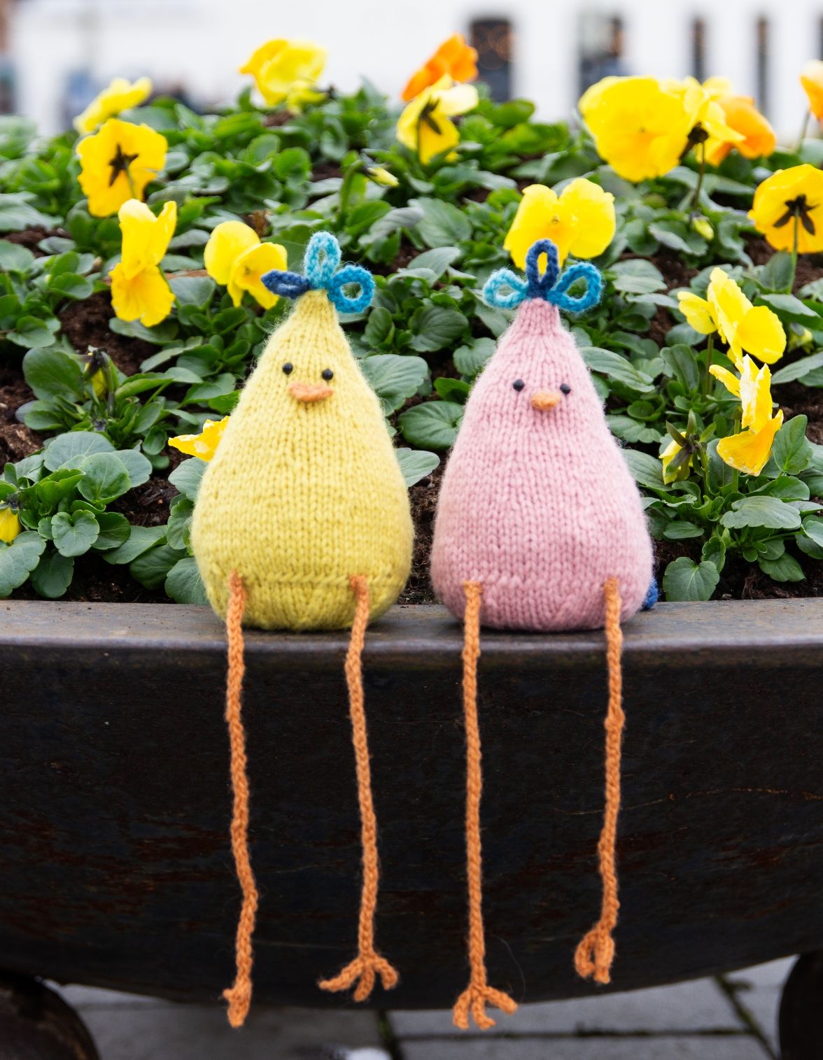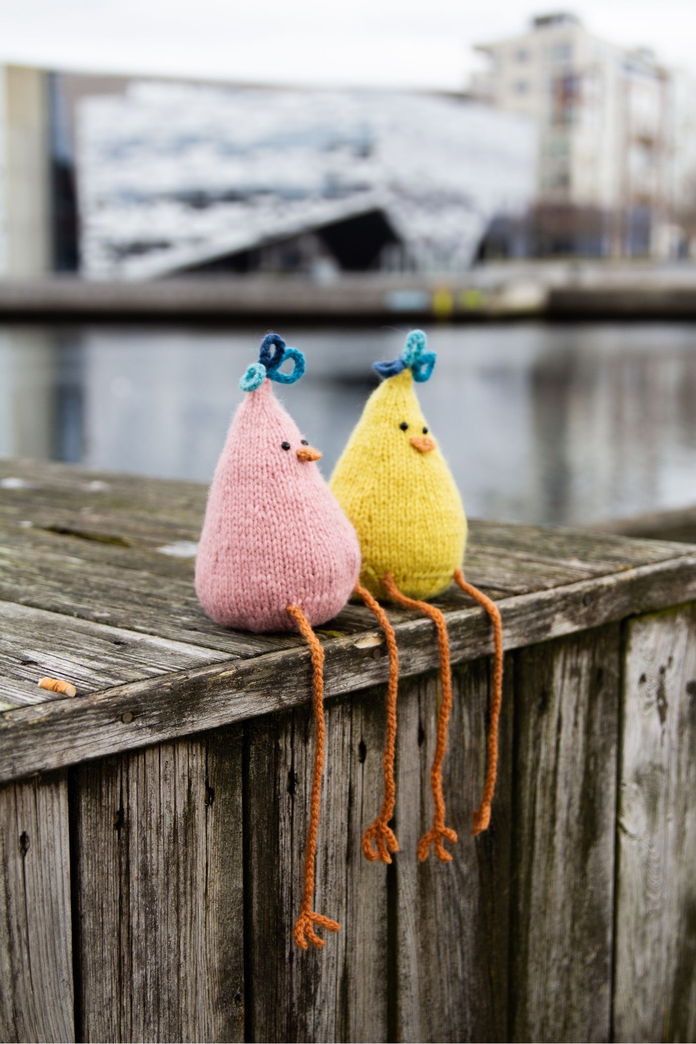 Strikket påskekylling med heklede bein. Strikket i Fritidsgarn og tynn Peer Gynt.