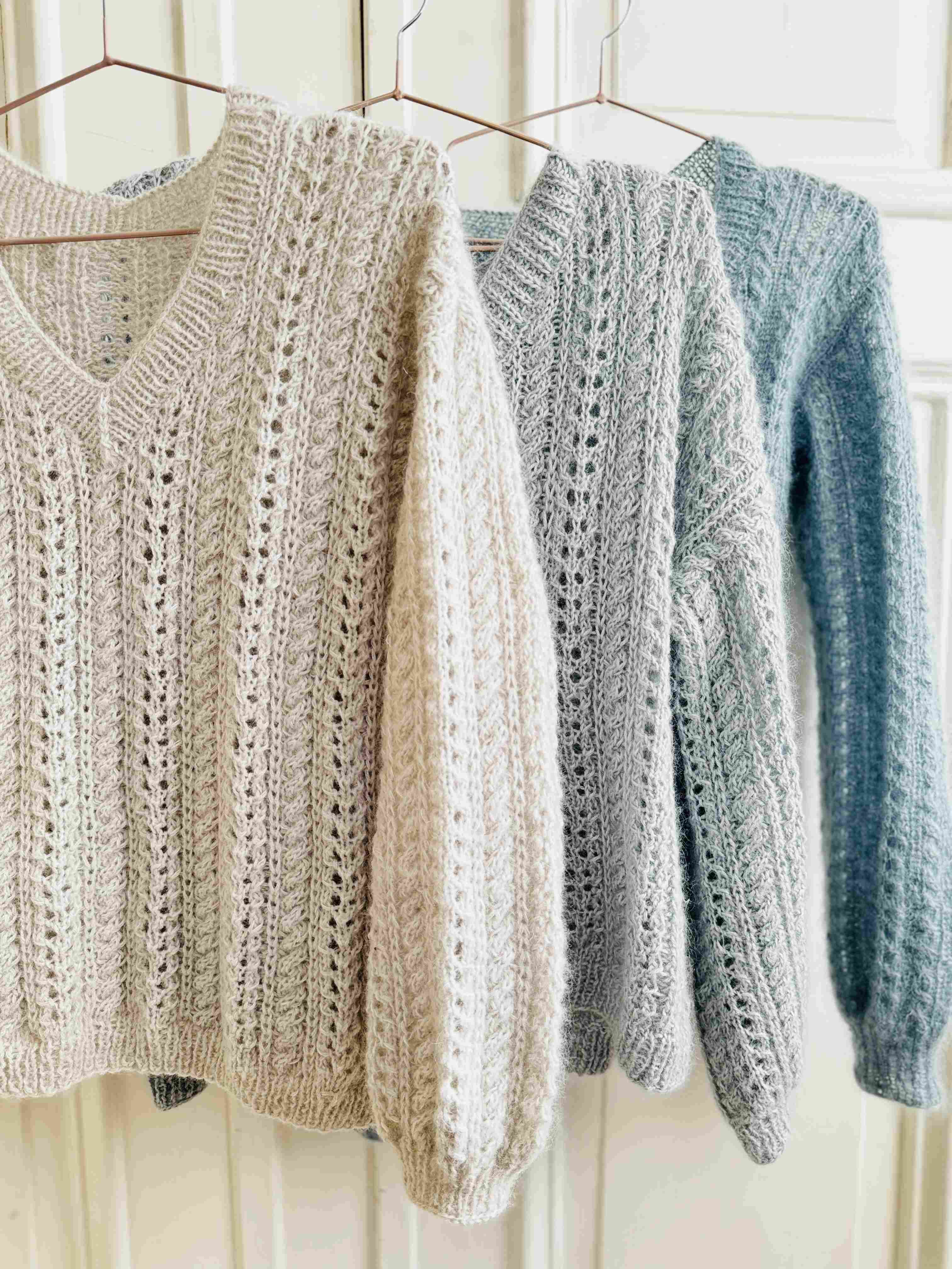 ovenfra og ned. Til slutt strikkes det vrangbord i v-halsen.
