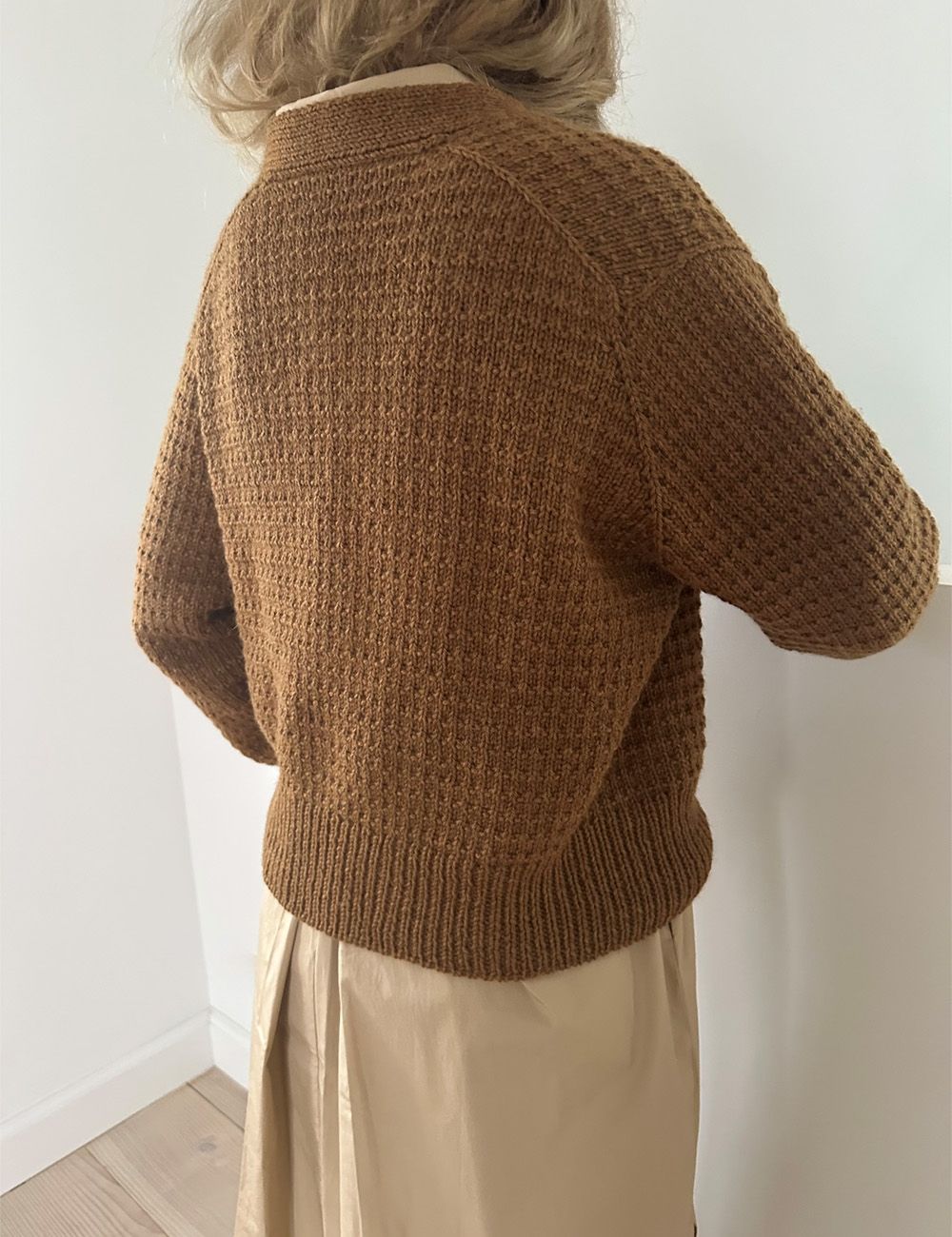 Strikkes ovenfra. Man begynner med øverste del av bakstykket, deretter strikkes øverste del av forstykkene ut fra de skrå skuldrene på bakstykket. Etter det strikkes det opp masker til toppen av ermet og herfra strikkes ermer, forstykker og bakstykke samtidig til slutten av ermehullet. Herfra strikkes bakstykke/forstykker ferdig. Deretter strikkes den loddrette ribbkanten langs forkantene og v-halsen. Ribbkanten strikkes fast underveis, altså samtidig med at den strikkes. Til slutt strikkes ermene ferdig.