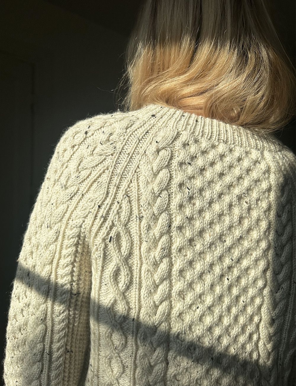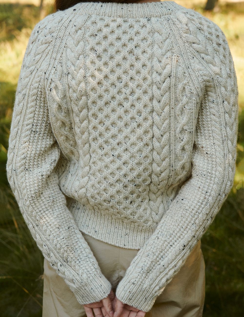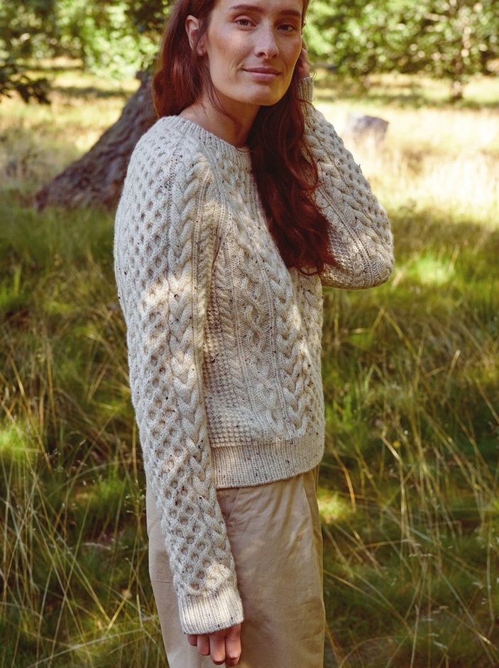 Cara betyr venn på irsk, og Cara sweater kan virkelig bli en trofast følgesvenn. Den er strikket ovenfra og ned i 100% ull, og så er den nesten umulig å slite opp og blir mykere etter hvert som du bruker den. Mønstrene er tradisjonelle irske aranmønstre, som gir genseren en tett overflate. Genseren har likevel en god passform fordi sidemønsteret - som også er på innsiden av ermene - er uten fletter.